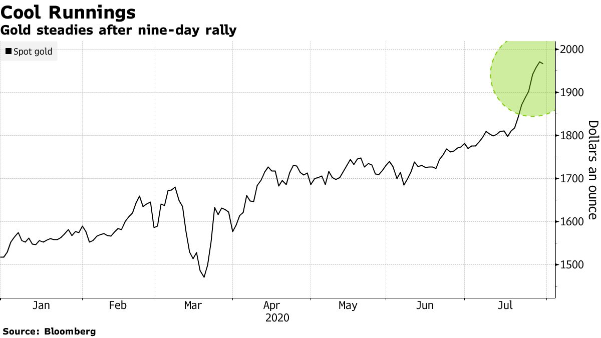 Respond to of 218847 RE <<cup .... handle>>bloomberg.com Gold Steadies After Nine-Day Rally as Fed Flags Risk From Virus Ranjeetha Pakiam 29 July 2020, 17:43 GMT-7 Gold paused after rallying for nine days to a record as investors weighed comments from the Federal Reserve on uncertainties over the economic recovery amid the coronavirus pandemic. Bullion was supported as the U.S. central bank left interest rates near zero and vowed to use all its tools to drive the recovery from the downturn that Chair Jerome Powell called the most severe “in our lifetime.” He sounded a dour tone, noting that more fallout from the outbreak still lies ahead. U.S. deaths surpassed 150,000, the highest official toll in the world. Gold has soared almost 30% to a record this year as the pandemic drove demand for havens amid a weaker dollar and low interest rates. With more stimulus on the horizon, Goldman Sachs Group Inc. has said that bullion is the currency of last resort and forecasts a surge to $2,300 an ounce. Real yields on 10-year U.S. Treasuries are sinking toward -1%. “Gold should continue to rise higher after the Fed’s promise to keep the stimulus coming,” Edward Moya, senior market analyst at Oanda Corp., said in a note. “The Fed’s backstop is not going away, but if Congress botches the size and timing of the coronavirus relief bill, gold could consolidate before breaking beyond the $2,000 level.” Another round of talks between the Trump administration and congressional Democrats Wednesday brought them no closer to a compromise on a virus-relief plan, as enhanced unemployment insurance for millions of out-of-work Americans runs out. In his remarks, Powell said supporting the recovery would need help from both monetary and fiscal policy. Spot gold traded 0.3% lower at $1,965.90 an ounce at 8:17 a.m. in Singapore, after hitting an all-time high of $1,981.27 on Tuesday. Gold futures traded 0.2% higher at $1,981.60 after peaking at $2,000 this week. Spot silver fell 0.2% to $24.2614 an ounce, and is down for a third day. The Bloomberg Dollar Spot Index steadied near the lowest in almost two years. Before it's here, it's on the Bloomberg Terminal. LEARN MORE