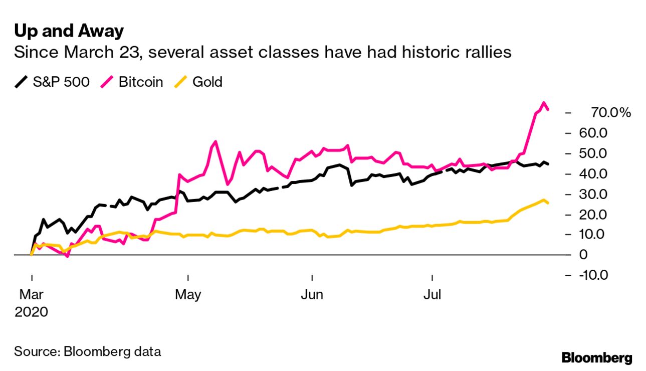 Bitcoin is up about 55% in 2020, while gold has risen 29%, smashing the record price set in 2011, as investors flock to the precious metal as a hedge against inflation. Stocks, meanwhile, have surged since bottoming out at the start of the coronavirus outbreak in the U.S.: From March 23 to July 1, the S&P 500 rallied 40%, its best 100-day performance since 1933, according to Bespoke Investment Group.