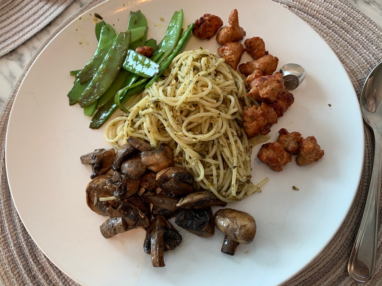 Pasta, pesto, greens, mushrooms, Italian sausage