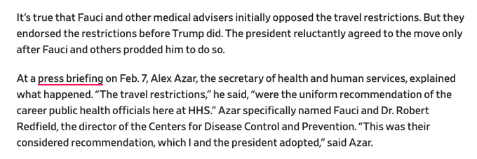 Trump yesterday, on Fauci: "He didn’t want to ban people from China from coming into the country, and I overrode him." That's false, according to this statement from Azar. And NYT's reporting says Trump didn't support the ban until Fauci did. t.co