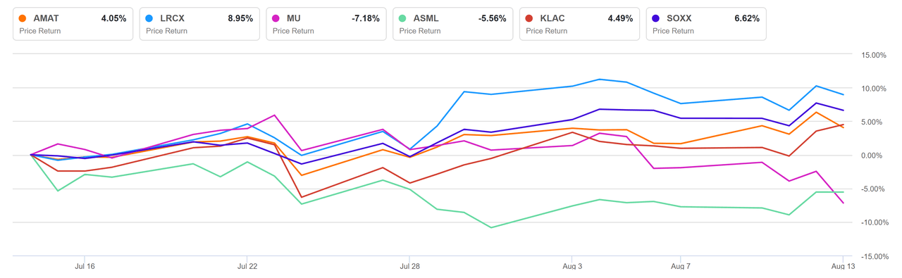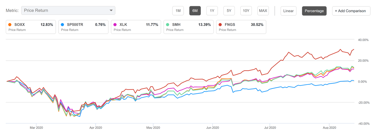 To: Sun Tzu who wrote (10215 ) 8/14/2020 9:26:16 AM From: Kirk © Read Replies (2) | Respond to of 26768 How much higher will they go on this run? AMAT up, but chips also facing some pressure at record highs: At the Open Aug. 14, 2020 9:00 AM ET About: iShares PHLX SOX Semiconductor... (SOXX) By: Kim Khan , SA News Editor Semiconductor stocks are lifting the SPDR Information Technology Sector ETF ( XLK , +0.2% ), the only sector in the green ahead of the opening bell. The lift in sentiment is coming from Applied Materials ( AMAT , +3.7% ), which beat on FQ3 profit and revenue after the bell yesterday . The stock is enjoying some price-target boosts from the sell side this morning . Stifel analyst Patrick Ho maintains a Buy rating and lifts AMAT's target from $75 to $85, saying the company was "constructively positive" on H2 "even as alarms were being signaled on the memory front” from Micron yesterday. Lam Research ( LRCX , +0.8% ), Nvidia ( NVDA , +0.7% ) and Intel ( INTC , +0.5% ) are among the leaders in the tech sector premarket, although trading is volatile. KLA ( KLAC ) is flat. There is a question of how much more room to run there is for semiconductors in this rally. Along with the broader market, chips themselves are also at lofty levels, with the iShares PHLX SOX Semiconductor Sector Index ETF ( SOXX , +0.1% ) setting a record close of $302.57 on Wednesday. The six-month performance of chips shows a slight outperformance from the tech sector overall, but behind the high-flying megacaps and momentum names. The SOXX and the VanEck Vectors Semiconductor ETF ( SMH , -0.2% ) are up about 13% in the last six months. That compares with XLK’s gain of about 12%. The MicroSectors FANG+ ETN ( FNGS ) is up nearly 31% in that time. Sector Watch Also at all-time highs are retailers, even at a time when stores are shuttered all over the U.S. The SPDR Retail Sector ETF ( XRT , -1.2% ), which does not have Amazon as a top-10 holding but has big exposure to e-commerce, is struggling despite a better-than-expected rise in core retail sales for July and upward revisions for June . This may be another area that has trouble pushing further into record territory without some support form the rest of the market and more clarity on the economic situation, especially regarding fiscal stimulus.seekingalpha.com