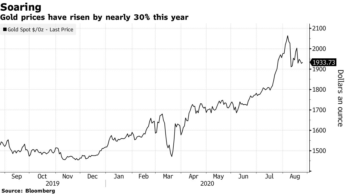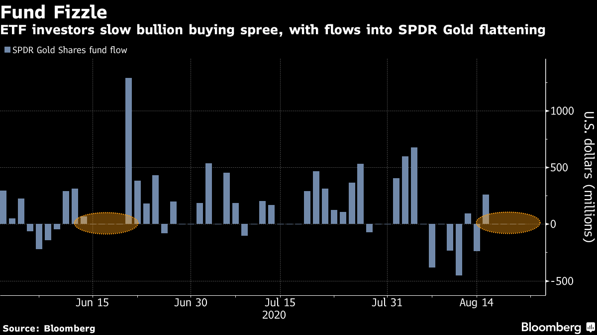 Respond to of 217705 <<Gold>> anti-gold forces poking out headsbloomberg.com Gold Rally Sputters With Bets on Vaccine, Economies Denting ETFs Justina Vasquez 25 August 2020, 01:14 GMT+8 LISTEN TO ARTICLE The rally in gold, which surged to an all-time high two weeks ago, is showing signs of losing steam with hopes for a coronavirus treatment and signs of improving economies undercutting the metal’s appeal as a haven. Bullion posted back-to-back weekly losses for the first time since June, and on Monday headed for its third decline in four sessions. Gains in holdings of gold exchange-traded funds, a key driver of the metal’s surge this year, have also slowed. Inflows into SPDR Gold Shares, the top ETF backed by the metal, have been flat for four straight sessions, the longest run in two months. Gold has slipped about 7% from a record on Aug. 7, buffeted by improvements in some U.S. and Chinese economic indicators and speculation that efforts to expedite virus treatments could soon yield results. Investors are awaiting Federal Reserve Chair Jerome Powell’s speech Thursday at the Jackson Hole Economic Policy Symposium. Last week, Fed policy makers panned the yield-curve control idea that had helped bolster bullion. “Gold is continuing to consolidate following its rapid rise until the start of August,” Commerzbank AG analyst Carsten Fritsch said in a note Monday. “‘This can also be seen in the wait-and-see attitude of ETF investors. The gold price is likely to find it hard to make further gains without any impetus in the form of ETF demand.” Bullion has risen about 27% this year, making it one of the best-performing commodities, on massive liquidity injections from central banks and governments trying to help economies to recover from the virus pandemic. But risk-on sentiment in broader markets is now eroding those gains, with equities surging to new highs and Treasury yields starting to recover this month. The U.S. Food and Drug Administration confirmed Sunday that it had cleared a coronavirus treatment that involves blood plasma donated by people who’ve recovered from Covid-19. Separately, the Financial Times reported that Trump is considering whether to bypass normal U.S. regulatory standards to fast-track an experimental vaccine from the U.K. for use in the U.S. before November’s election. Meanwhile, Moderna Inc. said it plans to provide 80 million doses of its experimental coronavirus shot to the EU. The news on possible treatments “should be bullish for the dollar and bearish for gold,” Edward Meir, an analyst at ED&F Man Capital Markets in New York, said by phone Monday. Meir expects the metal will trade will trade from $1,870 an ounce and to $2,000 for the time being, with markets weighing Jackson Hole, coronavirus cases and the dollar. “This is just sort of a brief setback, but we need to consolidate for a while” he said. “You do need to get some consolidation as investors evaluate what’s next.” Spot gold fell 0.6% to $1,929.06 at 1:51 p.m. in New York. Futures for December delivery fell 0.4% to settle at $1,939.20. In other precious metals, silver, platinum and palladium also declined.— With assistance by Elena Mazneva Before it's here, it's on the Bloomberg Terminal. LEARN MORE