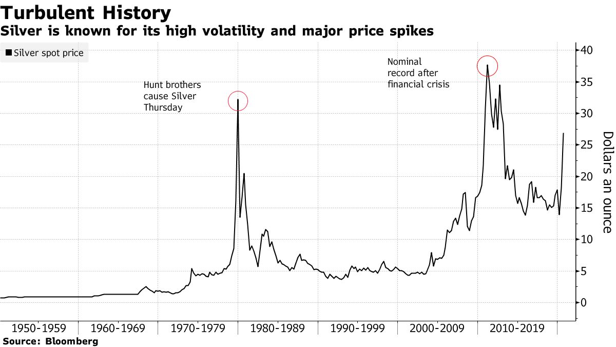 They have plenty of forebears. The Coinage Act of 1873 demonetized the metal in the U.S., sparking backlash against the government and allegations of corruption from the “Silverites.” The most notorious speculators were the Hunt brothers, three sons of a Texas oil billionaire whose fear of inflation and belief in the metal as a store of wealth prompted them to try corner the global market in 1980. They stockpiled more than 200 million ounces, driving the price to $49.45 before it crashed below $11.