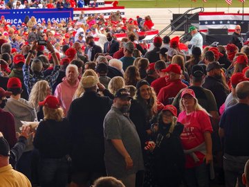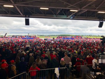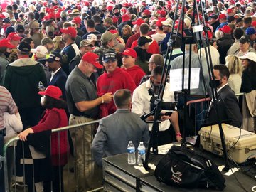 Very little social distancing and not many masks inside crowded airport hangar in Michigan for Trump rally.