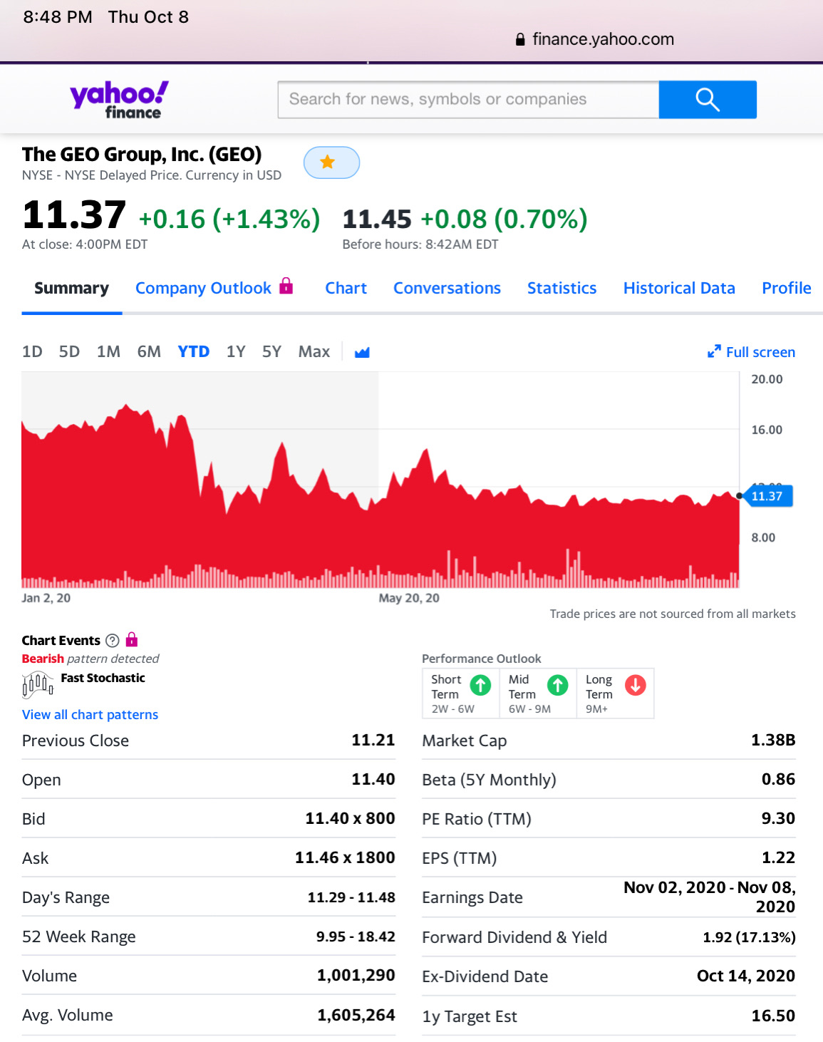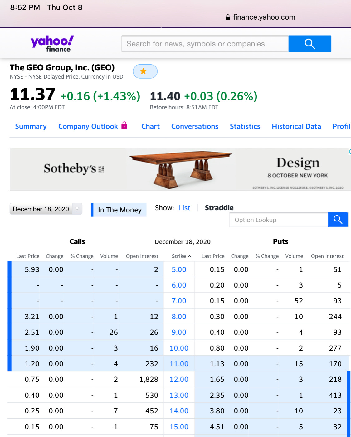 GEO also leveraged, pays a heathy dividends, allegedly at 17%, and sports okay option premium, at the money for December for Put + Call @ 20%