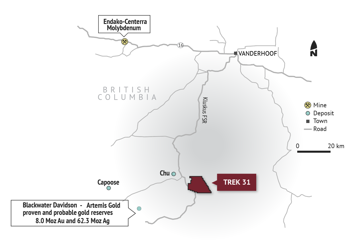 TREK31 is a gold-in-till anomaly located 30 kilometres northeast (Figure 1) of Artemis Gold’s Blackwater gold-silver deposit. The property covers ‘Target 31’ from Geoscience BC’s $4.0 million TREK initiative that identified a strong, continuous area of anomalism with no specific mineral association (porphyry versus epithermal) and no known source. Property highlights include: