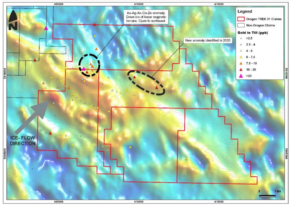 Orogen completed a tight grid of basal till sampling in 2018 to confirm a highly anomalous TREK sample that included 7 gold grains with anomalous silver, arsenic, mercury, copper and zinc. Additional sampling in 2019 consisted of till samples at nominal 250 metre spacing on three lines normal to ice direction and spaced roughly 1.5 to 2 kilometres apart.