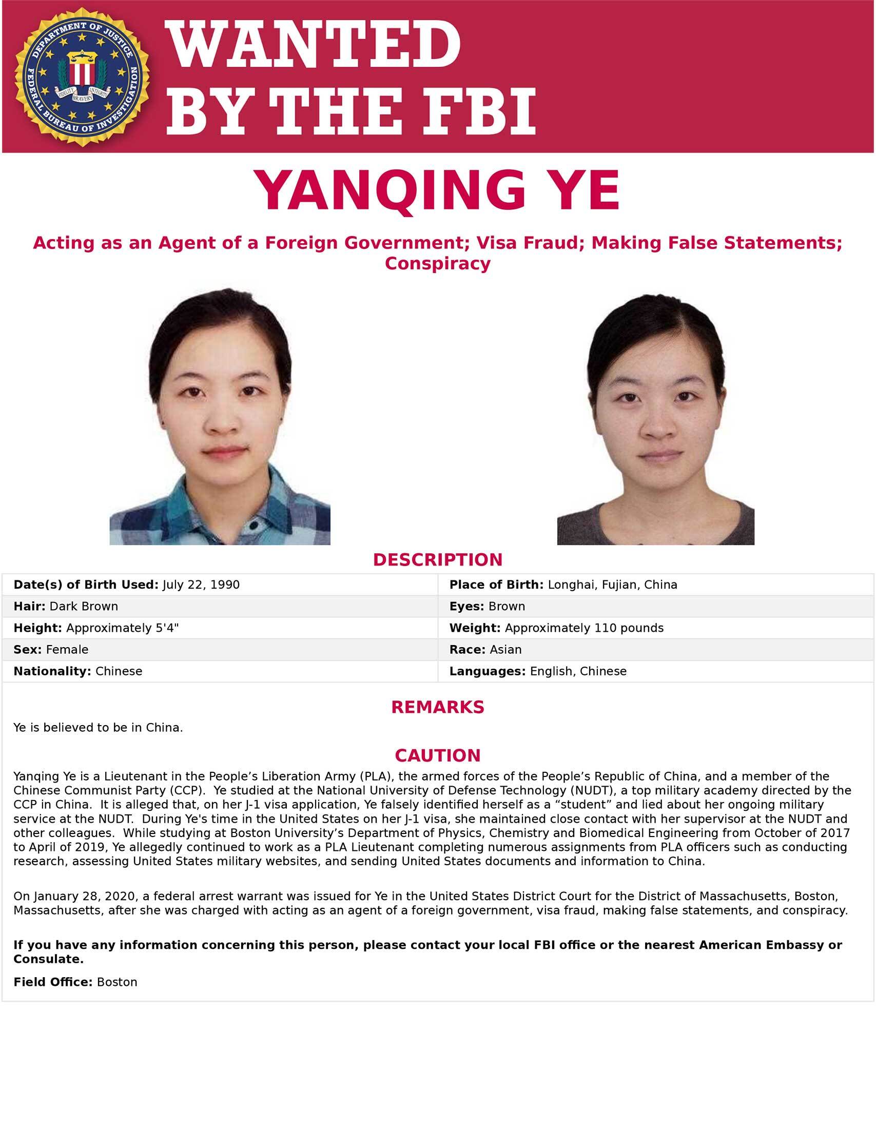 Ye was interviewed by federal agents in April 2019 at Boston’s Logan Airport as she was returning to China; she admitted she was a lieutenant in China’s military and a member of its ruling party. She was allowed to board the plane and return to China, where she is believed to remain. No charges were filed against her until January.