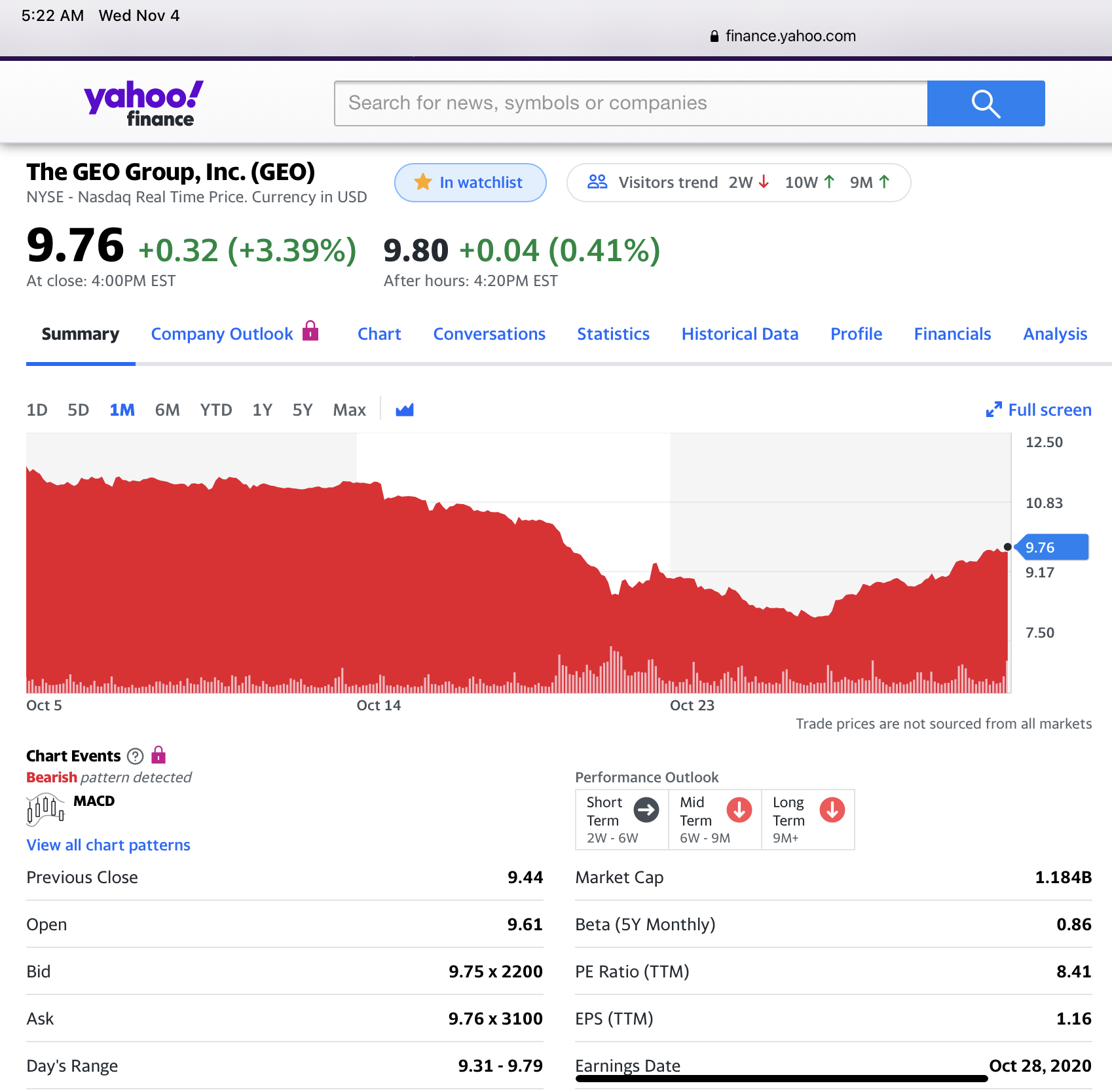 In the meantime am taking note that GEO tanked by 10+% since I fidgeted-out Message 32975225 about a month ago, even as conditions indicate the governing authorities shall have more invited guests to host finance.yahoo.com