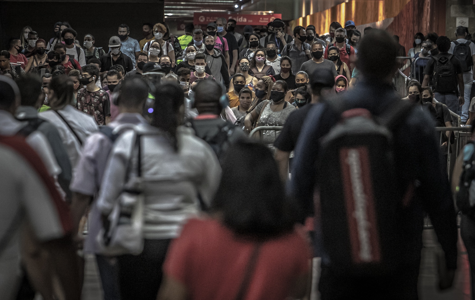 Commuters wear protective masks inside the Luz train station in Sao Paulo, Brazil, as the country surpasses 5.5. million infections.