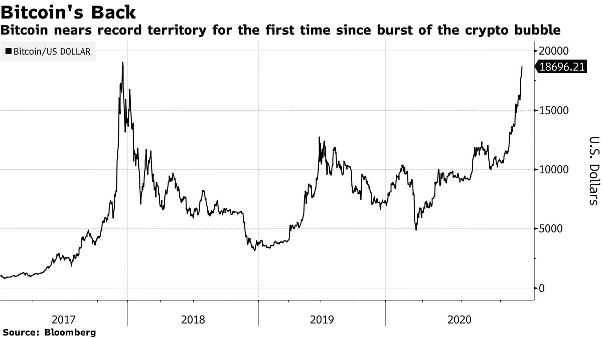 Bitcoin’s recent rise to $18,640 may give investors flashbacks to 2017, when the cryptocurrency reached a high of $19,783.21 in December before selling off. This time is different for one big reason, Wood said: the involvement of institutional investors, which she said could drive Bitcoin’s price to $500,000.