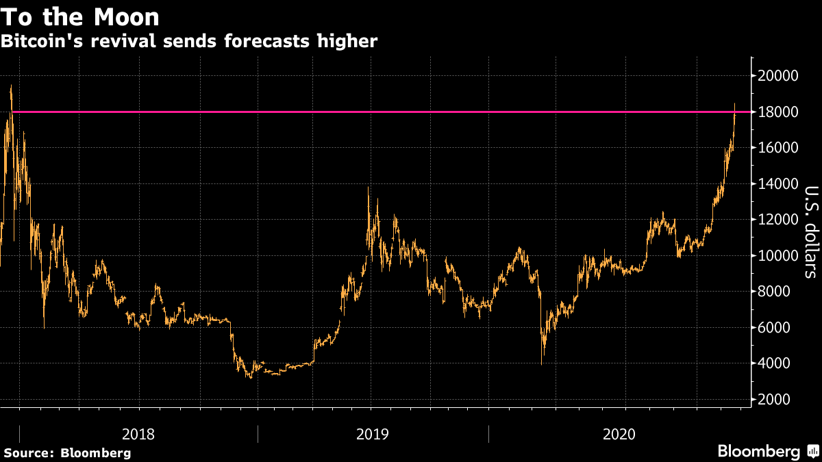 The world’s largest digital currency is in the midst of an exuberant rally that this week saw it cross above $18,800 for the first time in almost three years. Strategists and crypto fans alike are now rushing to project its next never-before-seen heights. Outside of the eternal to the “moon” pronouncements from Twitter pundits, forecasts vary from $25,000 to more than $300,000 by the end of next year.