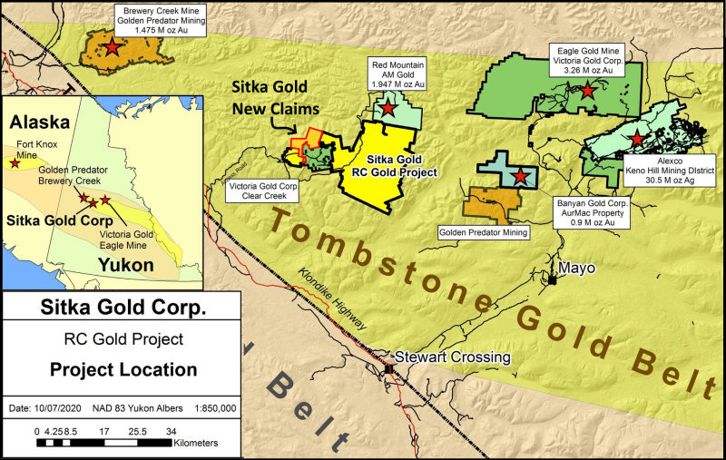 "Sitka's inaugural diamond drilling program completed at RC Gold this summer has discovered a large, robust, intrusion-related gold system that appears to have the scale and grade necessary to host an economic gold deposit", stated Cor Coe, Director and CEO of Sitka, "Further compilation of the historical and recently obtained geological data identified this newly acquired ground as a highly prospective target area that conforms to our modelling and greatly enhances our dominant land position within the Tombstone Gold Belt (Figure 2)".