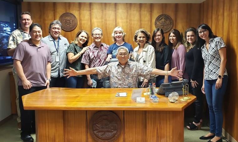 Here's my Democrat Mayor on Friday at a going away shindig here in Hawaii at the County Mayor's office. Same clown that locked us down, had police issuing $5,000 tickets for laying on the beach, did nothing while 40 plus died at a Vets nursing home less than a mile form his fat cat Mayor's office etc. ad nauseum and puke!