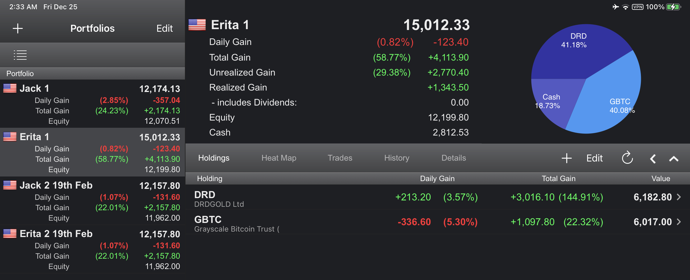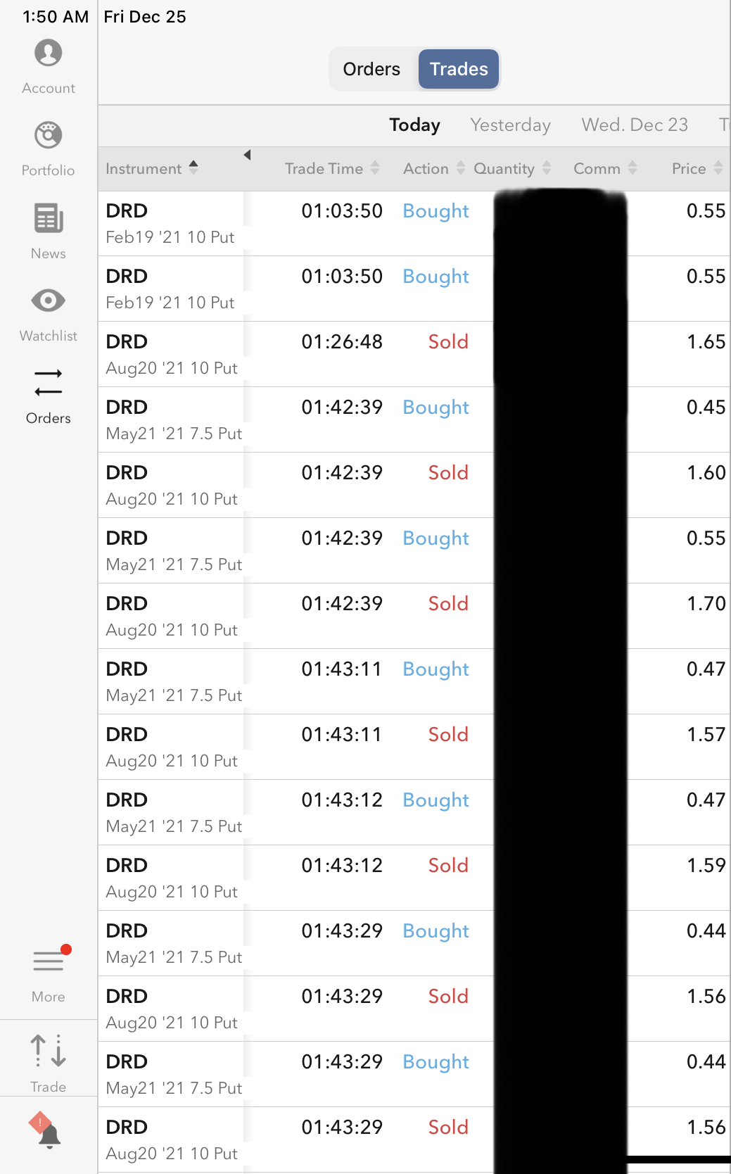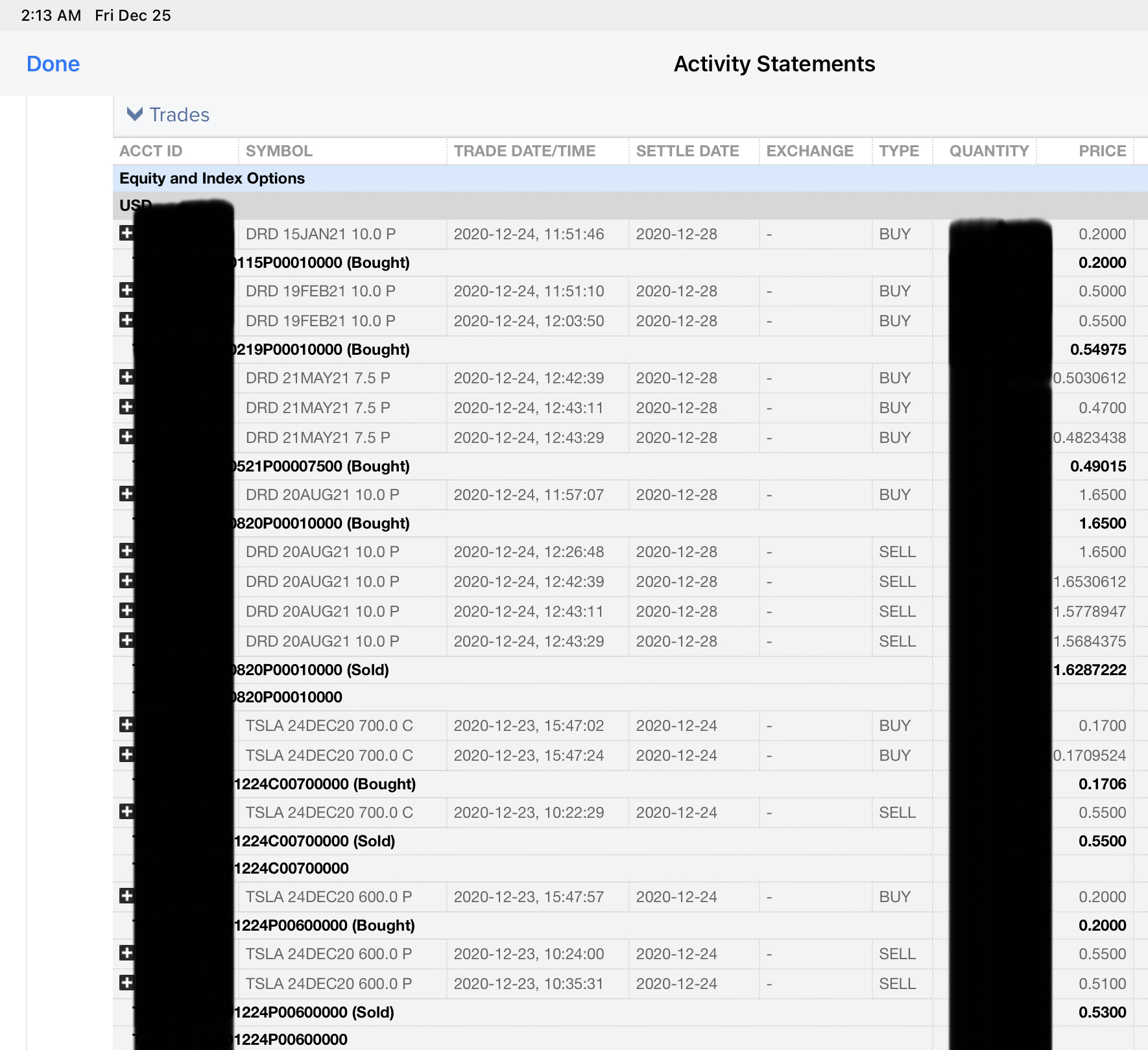 To: carranza2 who wrote (166345 ) 12/24/2020 2:11:57 PM From: TobagoJack Respond to of 218640 Re <<Drawdown>> Folks bum-rushed by all the negative regulatory kibitzing. GBTC heading higher, a wild guess. My GBTC almost a double in the relative short time. Might sell some and shall only buy more if TSLA keeps on giving. Overall position is 1/3 - 1/2 of TSLA gains-to-date. RE <<I thought TSLA would crash and burn after I made highly profitable sales, but it turns out that I left money on the table >> I vaguely remember that I reckoned you should consider exchanging some portion of your gains for leap calls so to remain in w/o all-in. I also remember and was able to search for this Message 32835868 <<unusual that you and I both are creating wealth from TSLA even as you are long and I am short >> No matter, all good and fun, so good. Beautiful 2020 well played. In the meantime did below, essentially ... (1) Closed / bought-back earlier shorted DRD Jan / Feb / May Puts, recognizing profit, and rolled for more cash by opening / adding to / shorting DRD Aug Puts, keeping obligations about the same or easier, given the ‘correct’ price of DRD is likely 10.5-11.5. The objective is to keep improving on the obligation burden, get more cash, and lower overall cost-basis. Okay to actually make good on obligations. (2) Sold then bought, between yesterday (NY time as opposed to HK time) and today TSLA call / put derivatives for profit and more profit. I engage in the same-day actions as sweetener to the longer-term (30-90 days) gaming of TSLA, to keep fit, and to top-up. The objective w/ TSLA is to remain generally net-short so as to secure overall NAV (i.e. should Nasdaq and general market crash then TSLA crash more), generate cash, never-ever make-good on promises, and using TSLA as negative-carry funding currency for DRD and GBTC and and and ... physical gold. (3) The kids managed (by answering yes / no to multiple choices along the way) the year-to-date well enough, scoring whatever, w/ the Jack more adventurous and the Coconut more steady steady; both good, w/ one portfolio of mix-bag stuff (DRD, GBTC, XOM, NIO, and PYPL) and another of totally useless stuff DRD and GBTC. They shall likely buy physical gold w/ the gains (anything above 10K) and reset portfolios to 10K on 1st January to play again 2021. The “19th February” is a side bet that was their birthday present where they get to keep the gains on closing of 19th February, 2021. On GBTC, they watched me for awhile and waited out their understandable hesitation / pause, then plunged in. A good lesson for them.
