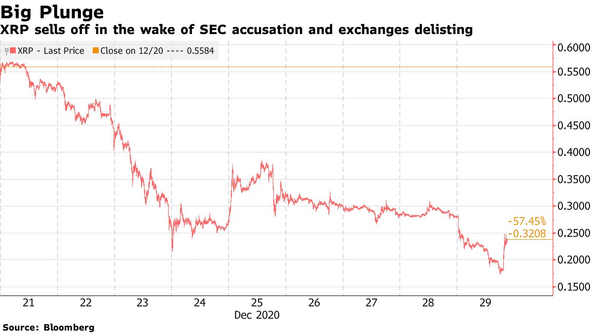 To: Julius Wong who wrote (166507 ) 12/29/2020 11:18:39 PM From: TobagoJack Read Replies (2) | Respond to of 218608 It is nice when the officialdom does our bidding, to stump on the riff raff and cull the pretenders :0)bloomberg.com Cryptocurrency XRP Is in Free Fall With Exchanges Delisting Coin Olga Kharif 30 December 2020, 02:04 GMT+8 A slew of exchanges delisted the coin following SEC lawsuit XRP continued its plunge after Coinbase became the latest U.S. crypto exchange to remove the world’s fourth-biggest coin in the wake of an SEC lawsuit against Ripple Labs Inc. XRP tumbled 37% Tuesday, bringing its drop to 60% in the week since securities regulators accused Ripple of issuing more than $1 billion in unregistered tokens. Coinbase said Tuesday that it will fully suspend trading XRP on Jan. 19, but will continue providing custodial services for clients. Customers will find it increasingly difficult to trade XRP after the largest exchange joined Bitstamp in delisting the token. Coinbase customers can move it to another exchange, but it is growing more likely that the regulatory challenge will lead other U.S.-based venues to follow suit. Last week, the Bitwise 10 Crypto Index Fund (ticker BITW) liquidated its position in XRP, which comprised 3.8% of its holdings. “This is obviously bad for XRP across multiple dimensions: fewer potential buyers, and lower overall liquidity. For XRP to work as Ripple intends, XRP needs to be very liquid, so this particularly harmful,” said Kyle Samani, co-founder of Multicoin Capital. The Securities and Exchange Commission said in last week’s suit that Ripple raised more than $1.4 billion through the sale of XRP without first registering it as a security with the agency, creating “an information vacuum” that mislead investors. San Fransisco-based Ripple has denied the allegations. “The SEC has introduced more uncertainty into the market, actively harming the community they’re supposed to protect,” Ripple said in a statement on its website. “It’s no surprise that some market participants are reacting conservatively as a result. We’ll be filing our response in a few weeks to address these unproven allegations.”