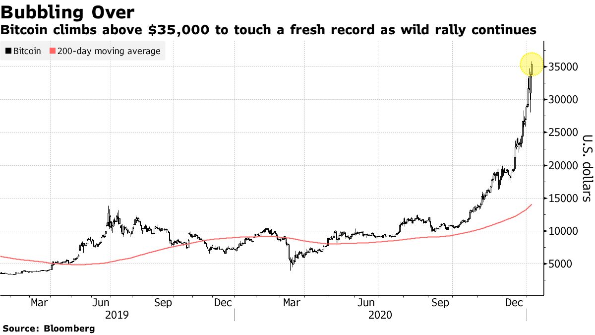 To: Roads End who wrote (166754 ) 1/6/2021 1:23:25 AM From: TobagoJack Respond to of 218633 << Bitcoin >> Now that I am false-premise mostly playing w/ 'house money' that in truth is bloomberg.com Bitcoin Tops $35,000 for Fresh Record as Wild Swings Resume Dave Liedtka Bitcoin jumped to another all-time high on Wednesday, just two days after registering its biggest one-day decline since March. The world’s largest cryptocurrency advanced as much as 6% to $35,842, surpassing the previous high of $34,792 set on Jan. 3. It plunged as much as 17% on Monday. The digital coin quadrupled in 2020. A range of factors have been cited for Bitcoin’s ascent, showing how hard it is to pinpoint the proximate cause for the latest bout of volatility. Some traders pointed to a JPMorgan Chase & Co. long-term price forecast of as much as $146,000, while others cited the overall risk-on mood in global financial markets. “Clear bull market, and we’re not getting 30% to 40% drops like in 2017,” said Vijay Ayyar, head of business development with crypto exchange Luno in Singapore. “The market is more mature with bigger buyers. Keep in mind though that we’re in a parabolic phase and they do top out.” More institutions and noted investors, from Paul Tudor Jones to Scott Minerd and Stan Druckenmiller, have either started allocating funds into Bitcoin or have said they’re open to doing so. “The chase higher is back on based on the notion that bigger main street investors are interested in building longer-term positions,” said Stephen Innes, chief global market strategist with Axi. “This is all about the new age embrace of blockchain technology to which Bitcoin is so uniquely intertwined.” While some argue that the cryptocurrency offers a hedge against dollar weakness and inflation risk in a world awash with fiscal and monetary stimulus, others say retail investors and trend-following quant funds are pumping up an unsustainable bubble. “Bitcoin is better at being gold than gold is at being gold,” Anthony Scaramucci, founder and managing partner of SkyBridge Capital, said in an interview Tuesday. The firm is the latest to get on the Bitcoin bandwagon, launching a crypto-centric fund this week.— With assistance by Matt Turner (Updates with industry comments throughout.) Before it's here, it's on the Bloomberg Terminal. LEARN MORE