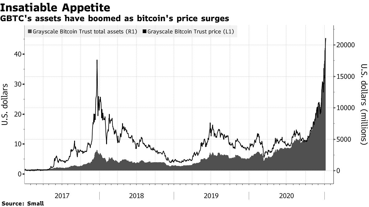 To: Maurice Winn who wrote (166831 ) 1/7/2021 10:16:26 PM From: TobagoJack Respond to of 217648 Update: now that I have my capital back am more enthusiastic than ever about bitgold, the largest single shot transfer of wealth between the generations, or something ultimately to be zero-edbloomberg.com Grayscale Holds Over 3% of Bitcoin, Sees Pension Interest Olga Kharif Grayscale Investments LLC ’s new chief executive officer says the world’s largest manager of digital assets expects increased interest from institutional investors such as pension funds and endowments to continue to fuel its rapid growth. The Grayscale Bitcoin Trust has become a bellwether for digital asset investors after accumulating more than 3% of the total supply of the largest cryptocurrency. “We’ve started to see participation not just from the hedge fund segment, which we’ve long seen participation from, but now it’s recently from other institutions, pensions and endowments,” Michael Sonnenshein, who was named successor to founder Barry Silbert on Thursday , said in an interview. “The sizes of allocations they are making are growing rapidly as well.” Grayscale has 10 funds and currently manages $25 billion in assets, up from $2 billion a year ago, Sonnenshein said. The Bitcoin trust has seen the majority of the inflows amid a rally that pushed Bitcoin to $40,000 on Thursday for the first time. Grayscale is planning to double its current staff of 24 employees, to continue to invest in advertising and to introduce half a dozen new products this year, Sonnenshein said. Grayscale’s funds operate as trusts that hold growing hoards of coins such as Bitcoin that are not redeemable by investors. Holders can sell their shares in most of the trusts in the secondary market. Grayscale Bitcoin Trust’s success may potentially be impacting Bitcoin’s supply, Sonnenshein said. “So there is definitely an argument to be made about Grayscale and really any other vehicle that may be removing Bitcoin from circulation and putting it into a financial product inherently increasing the scarcity of an already scarce asset,” Sonnenshein said. “This is a verifiable scarce asset and so when there are mechanisms that are removing them from circulation, that’s inherently making it an even scarcer asset.” Sonnenshein joined New York-based Grayscale in 2014, and most recently was its managing director. Prior to Grayscale, he was an associate at JPMorgan Chase & Co. and an analyst at Barclays Plc. Silbert will continue as chief executive of Grayscale parent, Digital Currency Group. (Updates status of fund sales. An earlier version corrected a typographical error in the first paragraph.) Before it's here, it's on the Bloomberg Terminal. LEARN MORE