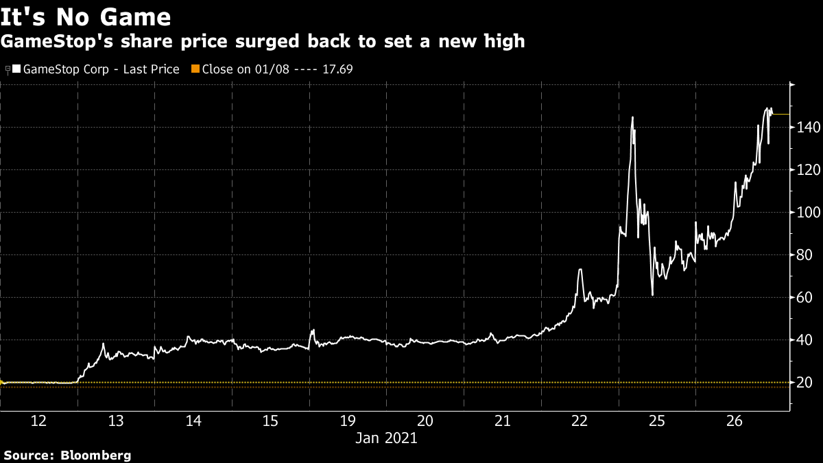 Infinite Game Of course the chart of GameStop Corp.’s stock price from yesterday is nuts. It closed on Friday at $65.01, opened yesterday at $96.73, got as high as $159.18 and as low as $61.13, and closed at $76.79. Almost 178 million shares traded, worth almost $17 billion. GameStop’s 10-day realized volatility is 308%. I am typing these words before the market opens on Tuesday, but by the time I send them the stock will have been trading for hours, and I am sure that it will have touched $4 and $4,000 and every number in between. It seems meaningless to talk about the price of GameStop stock, as though a single number could represent such an elusive concept. GameStop stock has all the prices at once.