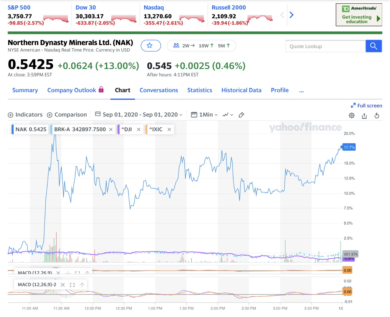 But, just as well you got the symbol wrong but got it right anyway, NAK is up 13% on the day’s high, and still rising in after-market, so you are very good, like I, we are geniuses compared to the cretins, morons, imbeciles, dullards, twits, simpletons, clueless, dumbphucks, and knaves who shorted anything except the Dow, Nasdaq and Warren Buffett’s company this day, or so it seems. You are with the good, because you are long!