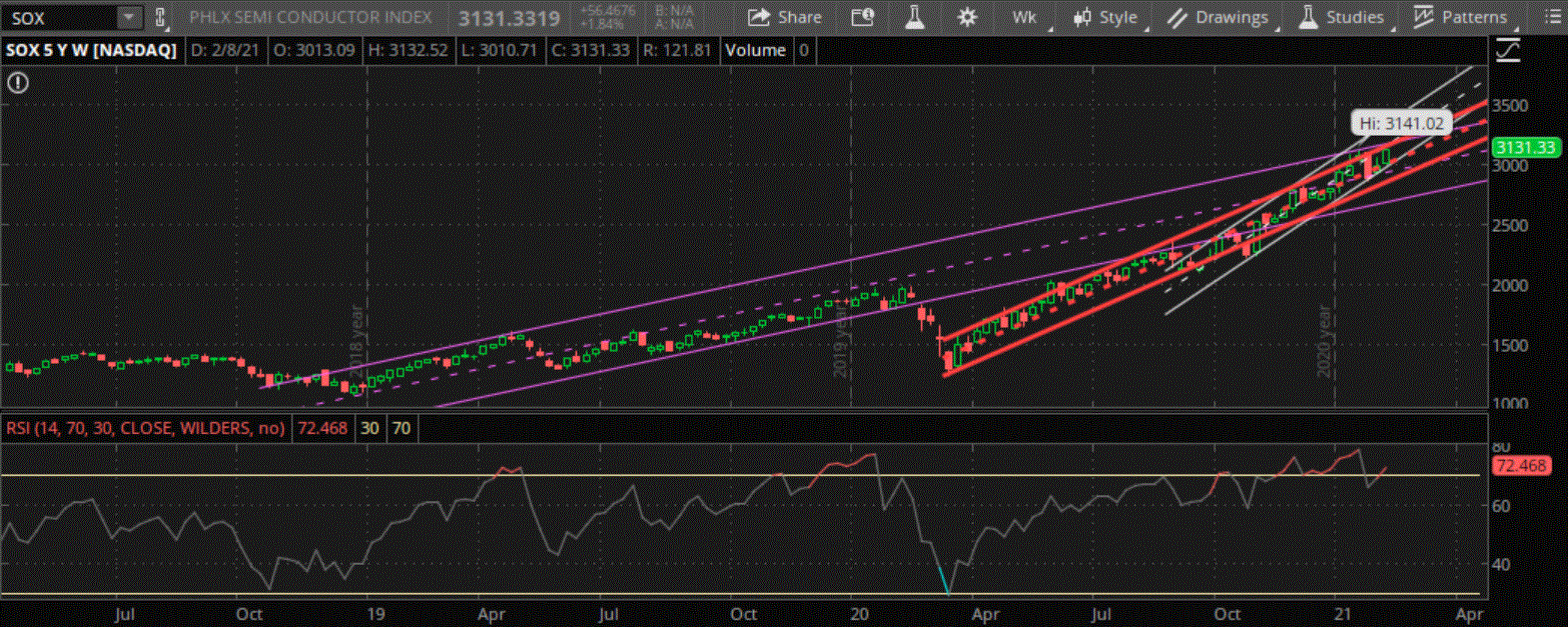I thought I'd share these 2 charts, a weekly and daily SOX chart. We can see the slope of the climb has been increasing, showing more bullish character as this rally has extended, with the light color slope getting more extreme.