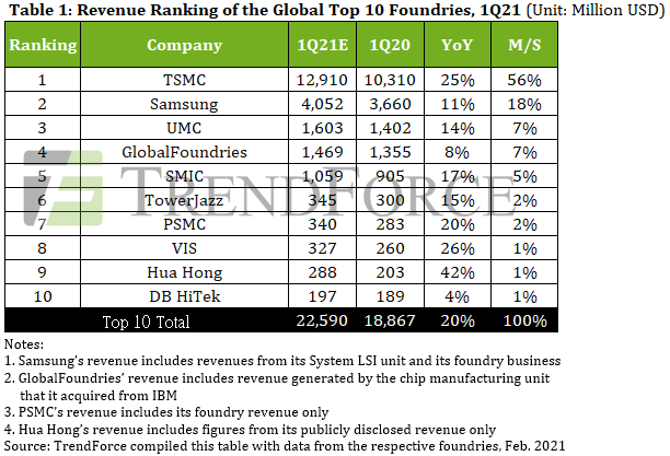 Read Replies (1) | Respond to of 95487 www.electronicsweekly.com/news/business/top-10-foundries-grow-20-q1-2021-02/ Top 10 Foundries To Grow 20% In Q1 Revenue for the top ten foundries is expected to grow 20% y-o-y in Q1, says TrendForce. 5nm wafer inputs are projected to account for 20% TSMC’s Q1 revenue. 7nm revenue, driven by demand from AMD, Nvidia, Qualcomm, and MediaTek, will account for 30% of TSMC’s Q1 revenue. Overall, TSMC’s revenue is expected to rise 25% increase YoY in 1Q21 on the back of demand for 5G, HPC, and automotive applications. As a result of demand for 5G chips, CIS, driver ICs, and HPC chips, Samsung’s capacity utilisation rates for the 5nm and 7nm nodes have been relatively high in 1Q21, and revenue is expected to be up 11% YoY. UMC is expected grow revenues 14% YoY in Q1. GlobalFoundries’ revenue is expected to increase by 8% YoY in 1Q21. SMIC’s revenue for the 14nm and below nodes is expected to decline in 1Q21 but the market for 40nm and above processes is expected to deliver a 17% increase. TowerJazz’s Q1 revenue is expected to be flat with Q4 but up 15% YoY. PSMC is primarily focused on manufacturing memory products, DDICs, CIS, and PMICs. At the moment, high demand for 8-inch and 12-inch wafer capacities and for automotive chips has resulted in fully loaded capacity for PSMC. The company’s revenue is expected to increase by 20% YoY in 1Q21. VIS’ capacity is fully loaded across all of its process technologies. Driven by increased spec requirements for PMICs and small-sized DDICs, VIS’ revenue is expected to increase by 26% YoY in 1Q21. Hua Hong is currently placing considerable emphasis on expanding the 12-inch capacity of HH Fab7 in Wuxi. Process technologies for 12-inch production lines, including NOR, BCD, Super Junction, and IGBT, have all passed qualifications. , thereby injecting fresh momentum into Hua Hong’s development. Hua Hong’s revenue may likely reach a 42% YoY increase in 1Q21.Message 33217490