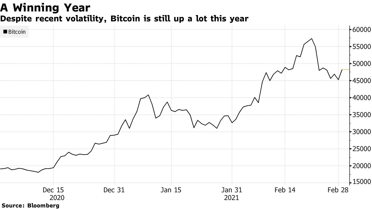 To: Julius Wong who wrote (169026 ) 3/1/2021 7:29:34 PM From: TobagoJack Respond to of 217739 Bullishbloomberg.com Bitcoin Rises as Citigroup, Goldman Find Allure Hard to Resist Olivia Raimonde 1 March 2021, 21:28 GMT+8 Bitcoin rallied after a volatile weekend session, riding a broad resurgence in risk assets, while Citigroup Inc. and Goldman Sachs Group Inc. warm up to the largest cryptocurrency. The digital asset rose as much as 9.4% before paring some gains to trade around $48,500 as of 2:19 p.m. in New York. Prices last week suffered the worst decline since March and dipped as low as $43,000 on Sunday. Bitcoin climbed to a record $58,350 on Feb. 21. In a report by Citigroup’s Global Perspectives & Solutions, strategists laid out a case for Bitcoin to play a bigger role in the global financial system, saying the cryptocurrency could become “the currency of choice for international trade” in the years ahead. Bitcoin has advantages over the current global payment system, such as its decentralized design, lack of foreign exchange exposure and traceability, the strategists said. Goldman restarting a trading desk for cryptocurrencies, a person familiar with the effort said. The Wall Street bank will begin offering Bitcoin futures among other products by mid-March after halting a similar effort started in 2018, according to the person, who asked to to be named because the plans haven’t been announced. “The more banks that come out with constructive comments on Bitcoin, the more likely the speculative bubble will continue to grow,” said Ed Moya, senior market analyst for OANDA. Citigroup’s full-throated backing of Bitcoin shows that crypto is continuing to win over the world’s biggest financial institutions. Dan Loeb, head of Third Point LLC, said in a Twitter post that he’s been “doing a deep dive into crypto lately,” adding that “it is a real test of being intellectually open to new and controversial ideas.” While banks continue to dip their toes deeper into the world of digital assets, a small group of corporations are busy snapping up coins to add to their balance sheets. MicroStrategy Inc. , announced Monday that it purchased an additional 328 Bitcoins increasing its pile to about 90,859. The company’s holdings are now worth over $4 billion. Bitcoin plunged 21% last week as investors dumped speculative assets amid a run-up in bond yields. The volatility has raised questions about whether it can act as a store of value and hedge against inflation. Detractors have maintained the digital asset’s surge is a speculative bubble and it’s destined for a repeat of the 2017 boom and bust. “Bitcoin’s wild ride is far from over, but it seems another attempt at $50,000 could be in the cards if the bond rout is truly over,” Moya said. “Bitcoin can survive a steady rise in Treasury, but not a skyrocketing move like we saw last week.” Crypto MiningElsewhere, China’s Inner Mongolia banned cryptocurrency mining and declared it will shut all such projects by April, spurring concern the communist nation will take more steps to eradicate the power-hungry practice. The autonomous region, a favorite among the industry because of its cheap power, also banned new digital coin projects, according to a draft plan posted on the Inner Mongolia Development and Reform Commission’s website Feb. 25. The aim is to constrain growth in energy consumption to about 1.9% in 2021. The sheer amount of energy needed to mine Bitcoin and the prospect that governments will create more obstacles for the largest cryptocurrency point to the token losing “most of its value over time,” BCA Research Chief Global Strategist Peter Berezin wrote in the report released Friday.— With assistance by Joanna Ossinger Before it's here, it's on the Bloomberg Terminal. LEARN MORE