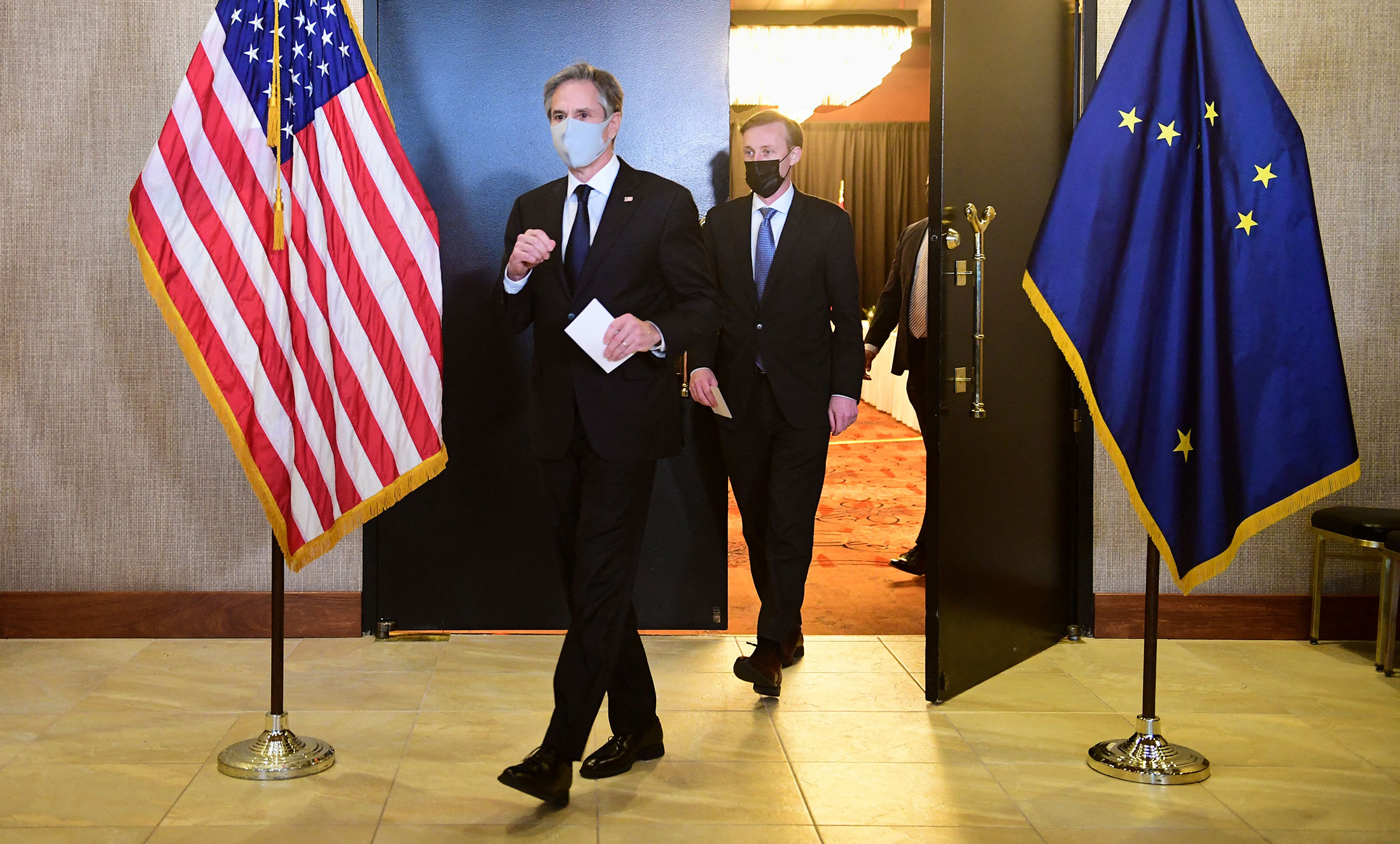 Antony Blinken, left, and Jake Sullivan exit the ballroom from the closed-door morning session of talks in Anchorage, Alaska on March 19.