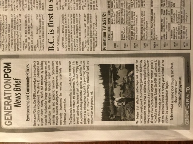 Generation mining has been advertising their case in weekend papers for the coming mine at Marathon.