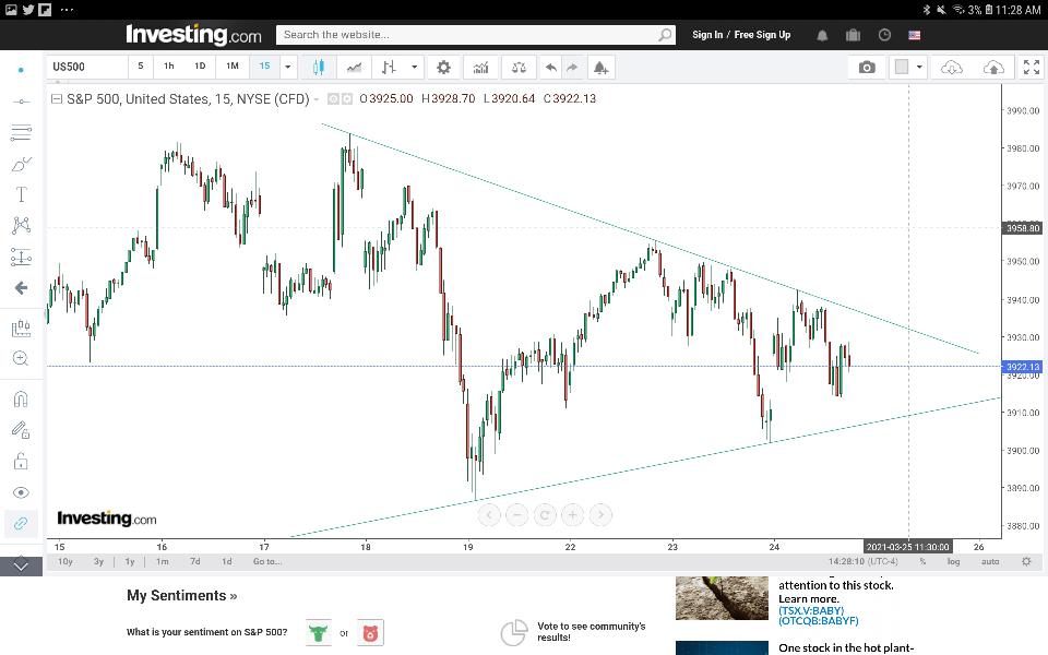 NDX & SPX - A couple of s-t reversal patterns have popped up, one in each index, that bear watching. If the break direction is down, which I believe to be highly likely, the downside reversal targets will be watched closely to see if they hold. When they give way, another massive sell signal will be generated that opens the abyss for this 2.5 mile descent to the ocean floor. The charts below show the diamond formation on the hourly NDX chart, and symmetrical triangle on the 15 minute SPX chart.