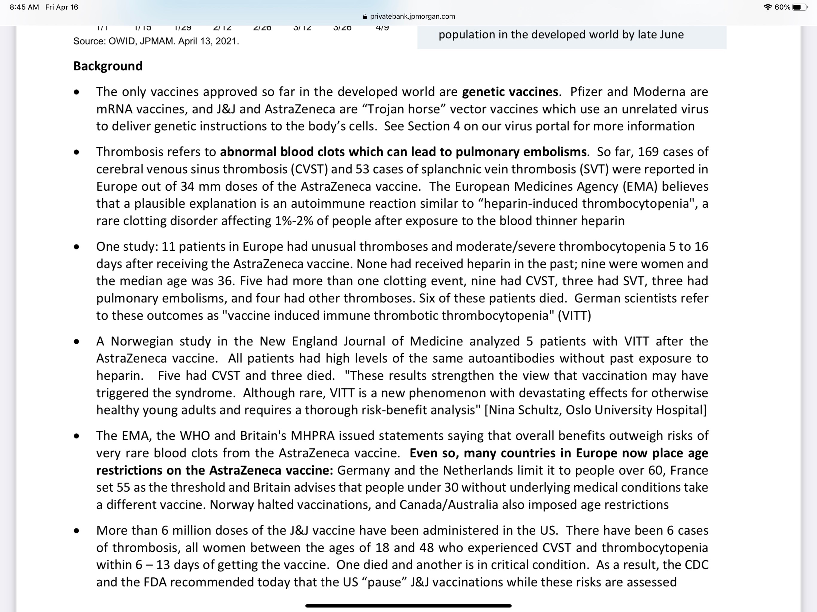 Read Replies (1) | Respond to of 793549 J&J is a “traditional” vaccine. Those vaccines consist of a weakened virus - or, the virus is destroyed, and they use fragments of viruses. Our immune system reacts to them - and creates antibodies. The new mRNA vaccines inject a template with instructions for our cells to build the viral spike protein. Then, our immune system develops antibodies to that protein. When we get attacked by the CoViD virus, those antibodies will protect us. The immunity from mRNA vaccines is more focused - on one single protein. So - I think, there is a higher chance for the vaccine to lose effectiveness, as the protein in question mutates. I think the new vaccines will turn out to be OK - but it will take years to know for sure. I didn’t hesitate about taking the shots. I’d be worried more about young people being injected with this new product. The Russian vaccine has been used quite widely since last August - and so far, it seems there are no BIG problems. It’s not clear what’s the deal with the J&J vaccine. If you inject into people millions of doses, you’ll encounter all kinds of different problems, not necessarily reactions. Since they used a weakened virus, I think the immunity they produce would be broader, against more than just one protein. I’d expect it to remain effective against more new strains - more so than the mRNA vaccines. There is no way to prevent a virus from getting inhaled - and try to multiply inside our bodies. Antibodies will make that more difficult. Most of the time the infection would get eliminated. Even if the virus will manage to cause an infection, it will tend to be mild - unlikely to cause major disease or death. No vaccine, to my knowledge, is 100% effective. Spreading unrealistic expectations helps create panic and confusion. A few days ago, I told someone that now, having been vaccinated, I would LIKE to get CoViD - in hopes that the infection would be mild, and I’d develop broader based immunity. I think this makes sense — but that person's chin dropped, and he looked at me as if I was crazy.