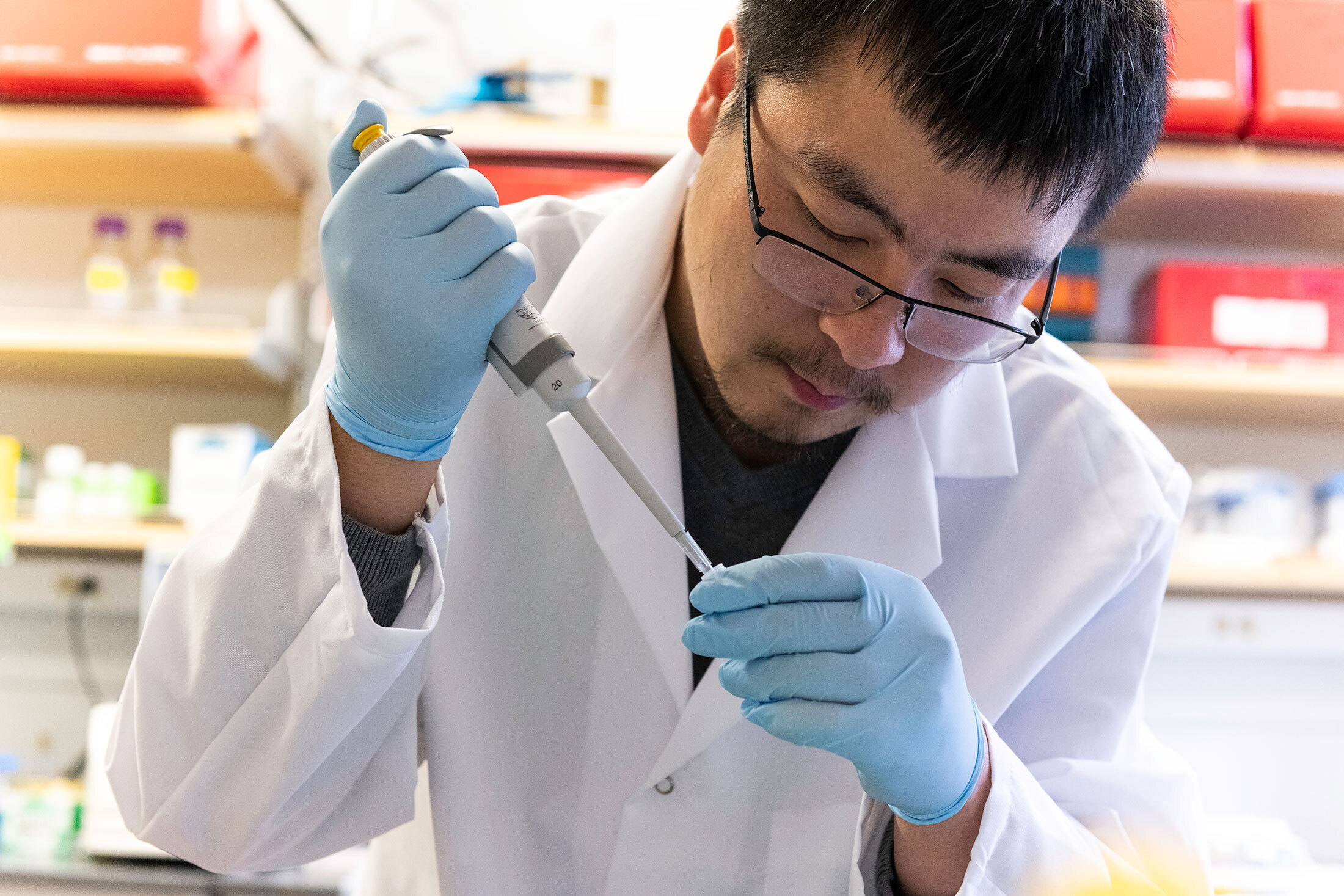 Wang in the lab at the University of Texas at Austin, in February 2020.