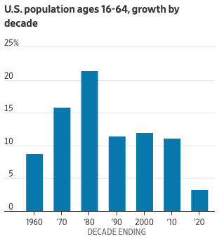 The U.S. population grew 7% between 2010 and 2020, the slowest since the 1930s, according to decennial census results released last month. The age breakdown isn’t yet available, but a smaller sample by the Census Bureau and the Bureau of Labor Statistics shows that the working-age population—those ages 16 to 64—grew just 3.3%. Because the share of those people working or looking for work has shrunk, the working-age labor force grew only 2%, and actually shrank last year. Some of those missing workers will return when the virus recedes, schools reopen and unemployment insurance becomes less generous. But many won’t: Baby boomer retirements have soared.