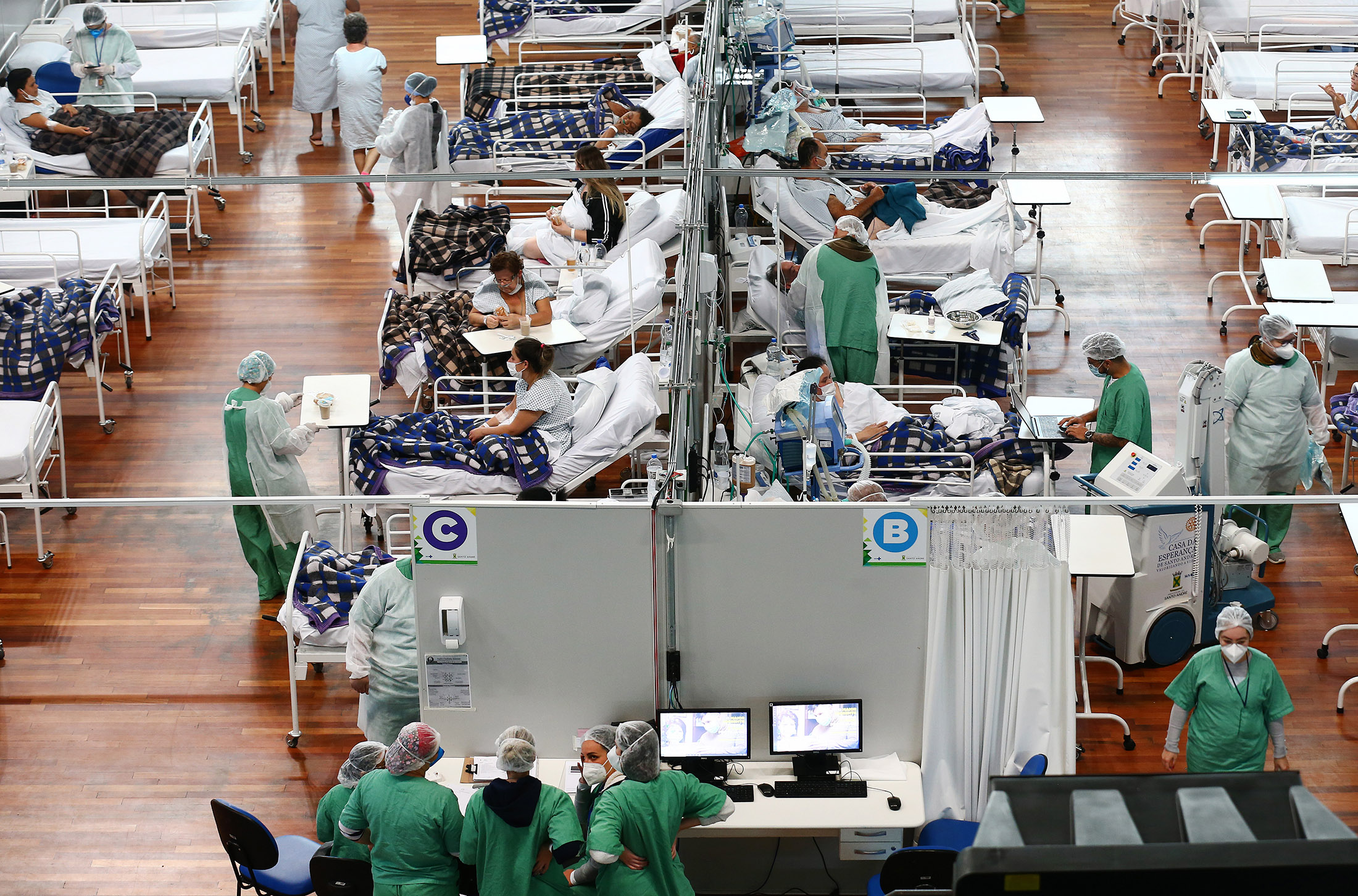 Healthcare workers treat patients at a Covid-19 field hospital in Santo Andre on May 17.