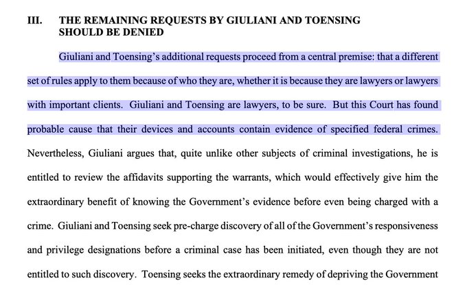 SDNY to judge in new brief, distilled: Rudy Giuliani and Victoria Toensing should not get special treatment. "Giuliani and Toensing are lawyers, to be sure. But this Court has found probable cause that their devices and accounts contain evidence of specified federal crimes."