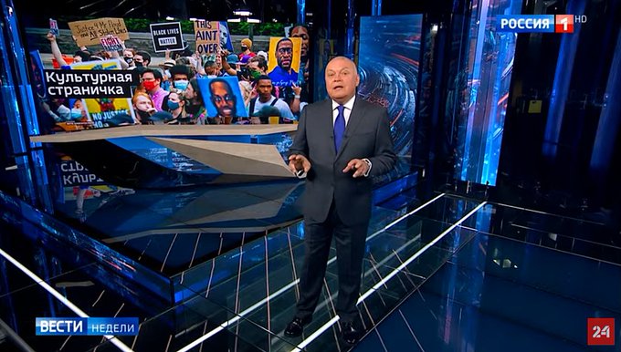 Top propagandist on #Russia's state TV, Dmitry Kiselyov, describes the U.S. as "an insane asylum," Russia as "an island of normalcy" and Tucker Carlson as his "colleague." Kiselyov expresses concerns about "racism against white men" (specifying that he isn't worried about women).