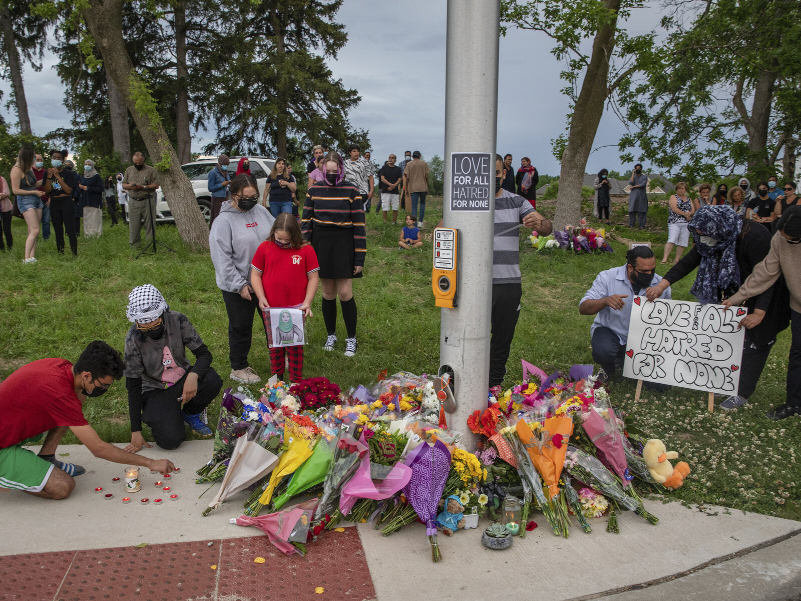 People attend a memorial on Monday at the location where a family of five was hit by a driver, in London, Ontario.
