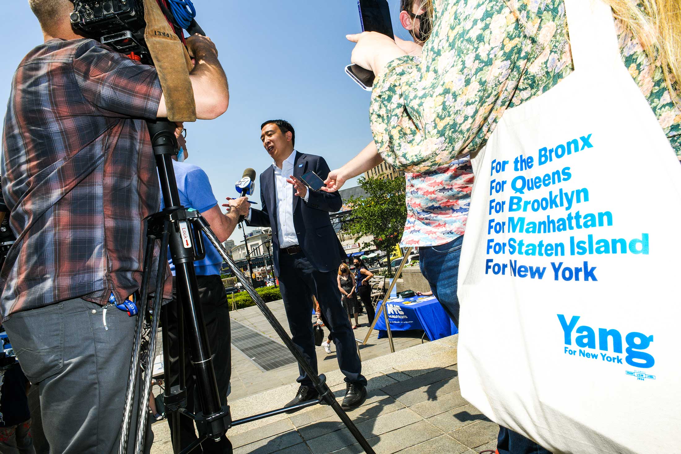 When the press conference ended, Yang looked deflated. He knew it hadn’t gone well. Hecklers had started to disrupt some of his events; a few days after the MTA debacle, I’d witness a woman call him names as he tried to eat his lunch.