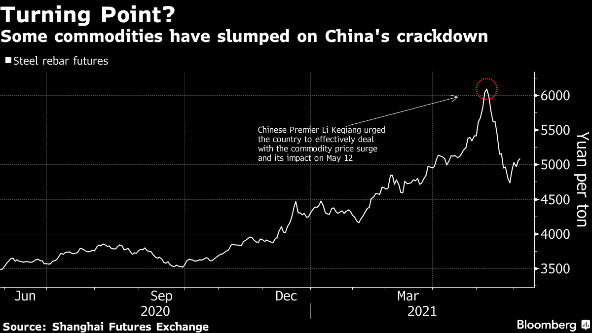 While strategists at Goldman Sachs Group Inc. and Citigroup Inc. have said any attempt to stop the rally will likely fail in the face of supply constraints and buoyant global demand, Chinese authorities show few signs of letting up after achieving some early successes. Prices for rebar and coal have fallen as much as 22% from their highs in May, though they’re still sitting on substantial 12-month gains.