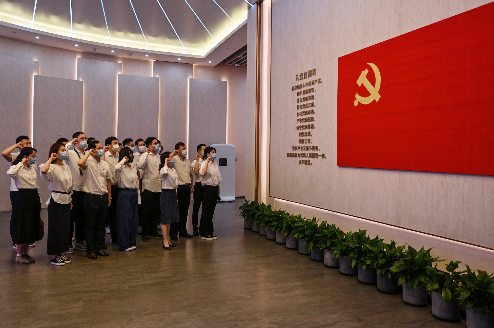 Oath-taking in front of the party flag at the museum in Shanghai.