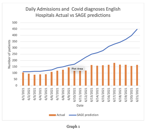Graph 1 shows the actual number of patients admitted with COVID from the community in June (orange bars). The blue line indicates where SAGE predicted it would be as a consequence of easing lockdown restrictions. How annoying – the data does not correlate with the prediction. In fact, hospital admissions are stubbornly refusing to increase significantly.