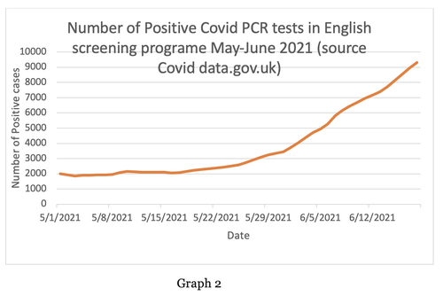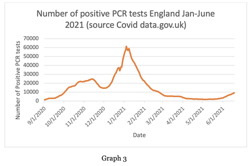 Never mind. If we simply state loudly that something nasty ‘could happen’ in the future that will cover just about every situation where the observable data do not support the required conclusion. And we can also show Graph 2 – which records the number of positive ‘cases’ in May-June 2021. The public won’t realise that most of these cases were asymptomatic and they may well think that they are the same as people being admitted to hospital.
