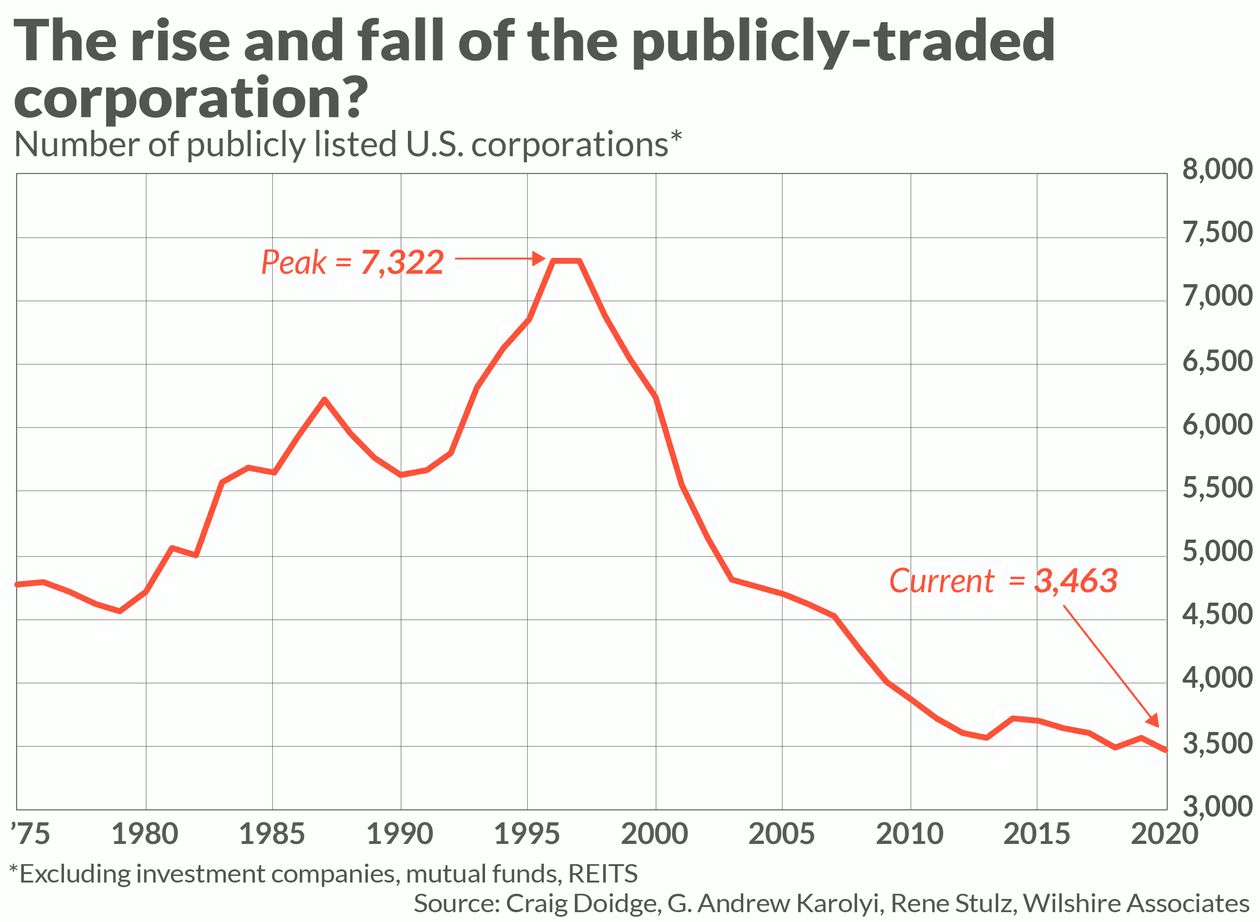One measure of the declining economic importance of the public corporation is the decreasing number of publicly traded companies, as reflected in the chart below. This decline has been overlooked by many on Wall Street, given their focus on the red-hot IPO market. But, as Karolyi pointed out, even as more companies are coming to market, there have also been an increasing number of delistings.