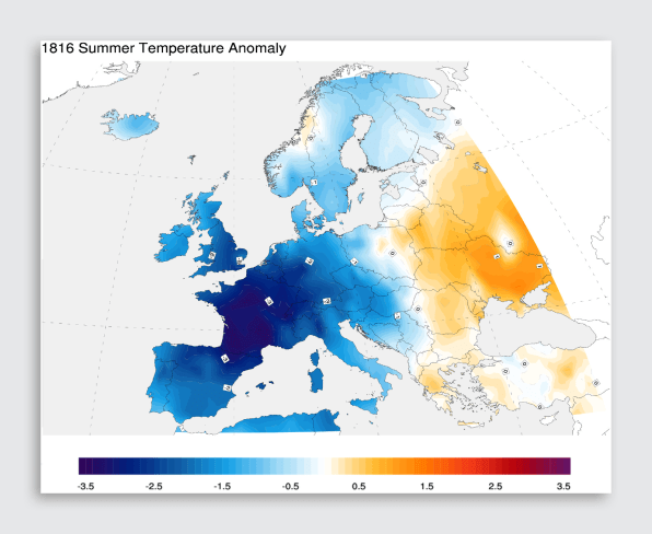 Temperatures fell well below normal in parts of Europe in 1816. [Image: Dagomar Degroot/CC BY-ND]Feedback loops also amplified and sustained regional cooling, similar to how they amplify regional warming today. In the Arctic, for example, cooler temperatures can mean more, longer-lasting sea ice. Ice reflects more sunlight back into space than water does, and that feedback loop leads to more cooling, more ice and so on. As a result, the comparatively modest climate changes of the Little Ice Age likely had profound local impacts.