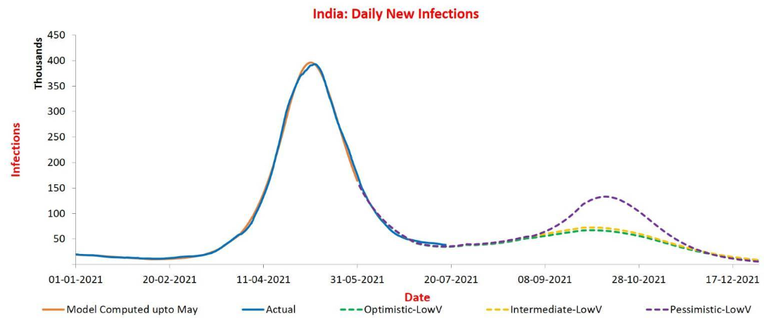 To: ggersh who wrote (175655 ) 8/2/2021 6:44:47 PM From: TobagoJack Read Replies (1) | Respond to of 218788 Re <<COVID>> The persistent / loitering nature of Covid reminds me of some typhoons that hit my neighborhood in the past, when the storm eye just settles in and goes round and round on top of us. The state makes weather forecasting easier but inconvenient otherwise. If we were in the movies, the script would likely run such that the future variants have little to do with past variants, and societal complacency coupled w/ general fatigue combine forces to make for Groundhog Day and Freddy XIV. Arguable that shutting down economy is not the way to go, because it mathematically makes the viral storm worse by negatively affecting nearly 100% of the people over a long duration. Just a suspicion.But that last wave also lead to high levels of natural immunity in the country’s nearly 1.4 billion people -- a factor that could blunt the impact of the next surge. A national antibody survey by the Indian Council of Medical Research study last month found that two-thirds of Indians above the age of six had been exposed to the coronavirus. bloomberg.com Forecaster Who Saw India’s Covid Peak Sees New Wave Coming Bhuma Shrivastava August 2, 2021, 1:33 PM GMT+8We're tracking the latest on the coronavirus outbreak and the global response. Sign up here for our daily newsletter on what you need to know. India is likely to see a rise in Covid-19 infections building into a new -- though smaller -- virus wave that may peak in October, according to a mathematical model by researchers who accurately predicted the tapering of a brutal surge of cases earlier this year. The country may see a worsening of its outbreak as soon as this month, with the next wave peaking in the best-case scenario with less than 100,000 infections a day, or nearly 150,000 in the worst scenario, according to estimates by researchers led by Mathukumalli Vidyasagar and Manindra Agrawal at Indian Institute of Technology in Hyderabad and Kanpur respectively. States with high Covid rates, such as Kerala and Maharashtra, could “skew the picture,” Vidyasagar told Bloomberg in an email. The next wave is likely to be far smaller than the second wave that peaked at a record 400,000-plus daily cases on May 7 and declined sharply thereafter. But the forecast still underscores the need for India to accelerate its vaccination campaign, deploy surveillance methods to catch emerging hotspots and stay vigilant through genome sequencing given the potential for new variants to emerge. The delta strain now causing renewed outbreaks across the world was first identified in India last October. Model created by Vidayasagar’s team. Experts are concerned about complacency setting in as people resume social and business activity in the face of waning infections. India’s first outbreak last year ebbed with limited damage, leading to a quick resumption of local travel and large-scale festivals that drove the emergence of a devastating second wave in March. With hospitals and crematoriums overwhelmed, researchers estimate that as many as 5 million people may have been killed in that outbreak. The government estimates of total Covid-related fatalities so far is 424,773.But that last wave also lead to high levels of natural immunity in the country’s nearly 1.4 billion people -- a factor that could blunt the impact of the next surge. A national antibody survey by the Indian Council of Medical Research study last month found that two-thirds of Indians above the age of six had been exposed to the coronavirus. Next Hotspot Five months after the last wave started, daily infections in India have plateaued at around the 40,000 daily mark. For the past five days, roughly half the new cases are coming from the southern state of Kerala, making it potentially the next hotspot. The higher infection rates in Kerala are likely due to the state conducting more testing than other places, where cases may be under reported due to limited detection efforts. Daily cases have grown persistently through July in Kerala and a few smaller north-eastern states, said Paul Kattuman , professor in the Judge Business School at the University of Cambridge, which has developed a Covid-19 tracker for India. But a few other Indian states also saw “short-lived flare-ups in July which abated relatively quickly,” putting the country overall in “a steady state” for now, he said. Read More A health worker administers a dose of the Covishield Covid-19 vaccine at a vaccination center set up at a school in New Delhi, on July 22. Photographer: T. Narayan/Bloomberg “If infection begins to increase in a few large states, the present balance will tip, and cases are likely to begin growing again in the country as a whole,” Kattuman said. “We might expect to see a slow-burn in the country for a duration -- this can be expected to last till vaccination coverage is sufficiently high to induce herd immunity.” India has so far administered 472.2 million vaccine doses, but only 7.6% of the population is fully vaccinated, according to Bloomberg’s vaccine tracker . The relatively slow uptake has added to concerns that the country may not be fully geared for the next wave. The central government led by Prime Minister Narendra Modi says it is now better prepared for further outbreaks and that future waves will not have the same impact on the economy as before. Customers shop for vegetables in the New Market area of Kolkata, earlier in June. Photographer: Arko Datto/Bloomberg Public health authorities need to conduct air and sewage water surveillance to detect virus clusters across city neighborhoods, according to Ram Vishwakarma , an adviser at India’s Council of Scientific & Industrial Research. This would catch potential infections before they escalate to hospital emergency rooms. Virus Hunters Sift Through Sewage to Detect Covid-19 Hotspots “Sewage water surveillance is the first 
