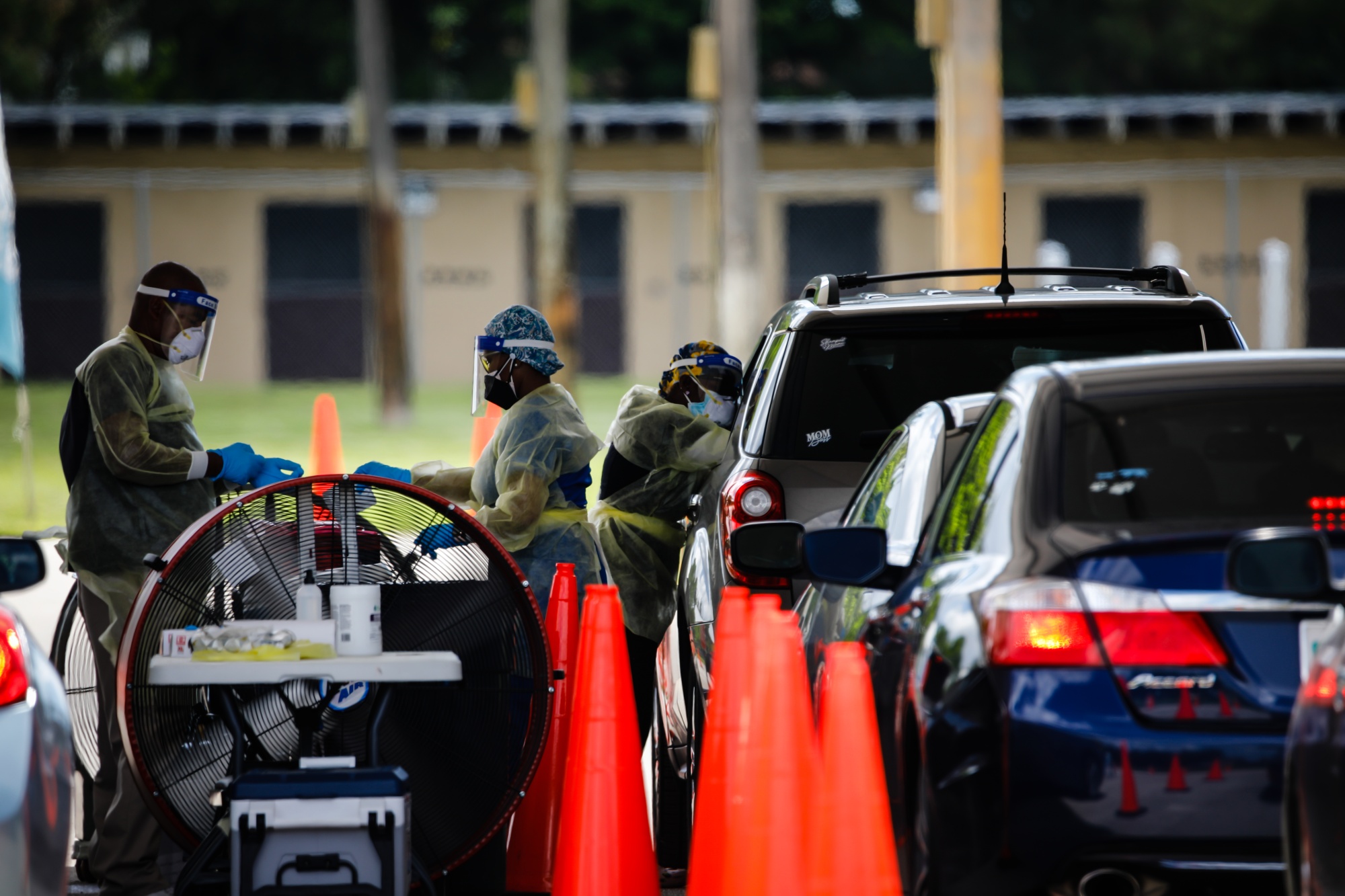 A healthcare worker administers a Covid-19 swab test at a testing site at Tropical Park in Miami, Florida, on Aug. 6.