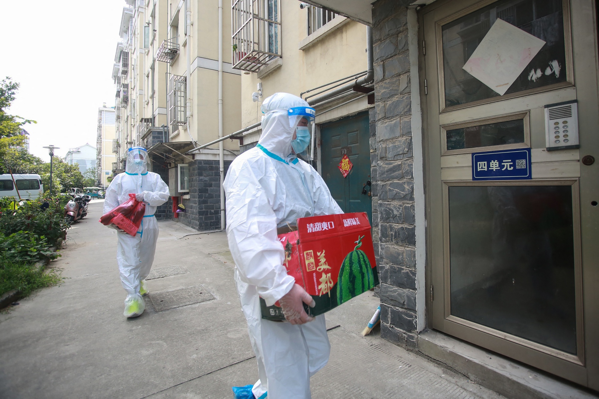 Volunteers and staff members carry food and daily necessities for residents at a restricted area in Yangzhou, in China’s eastern Jiangsu province, on Aug. 6.