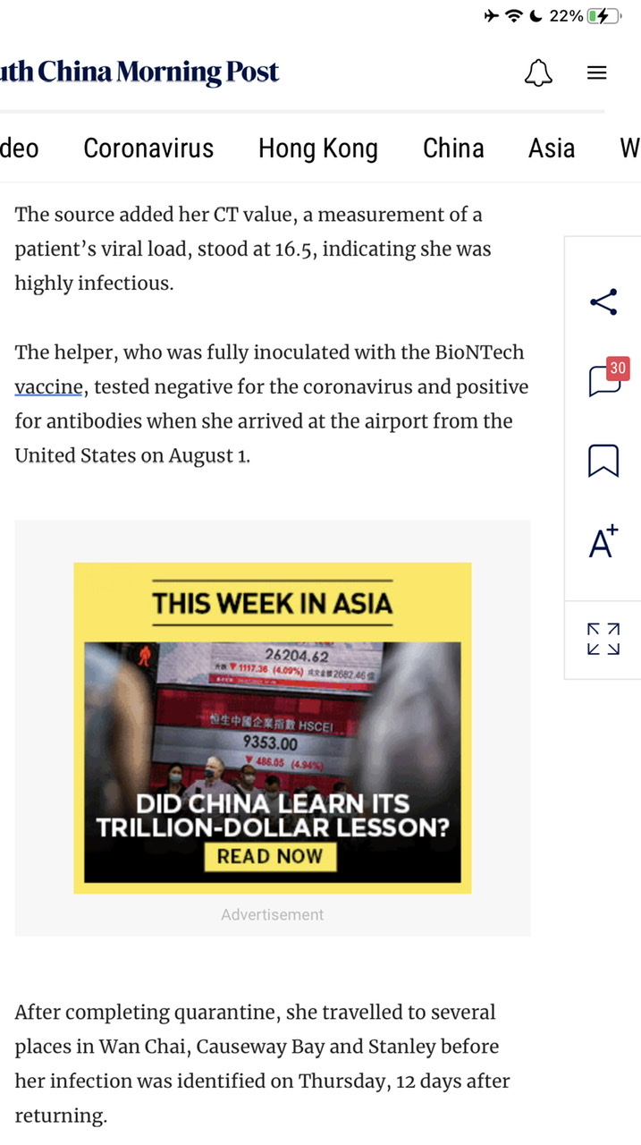 Whilst the Jack and I was away from Stanley home area of HK to camp on Lantau Island, a (presumably) Philippines domestic helper returning from the USA with her employer after summer break, was fully vaccinated (BioNTech), did the 7-days quarantine (in force for fully vaccinated people. Unvaccinated folks must do 14 / 21 days quarantine depending on where originating from), has developed presumably USA-caught Covid, and had meandered around Stanley, Causeway Bay, and Wanchai.