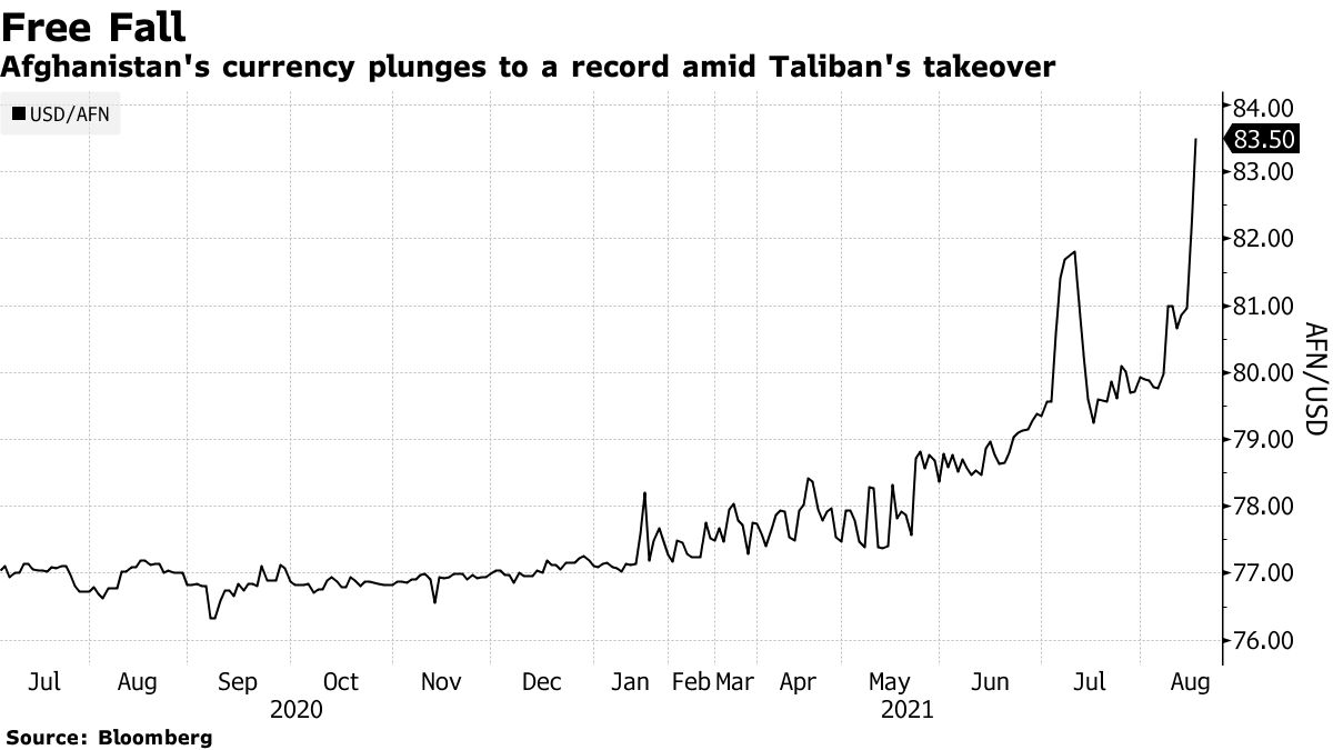 bloomberg.com Afghanistan Central Banker Flees, Currency Drops Amid Tumult Kartik Goyal August 17, 2021, 6:25 PM GMT+8 Afghanistan’s acting central bank governor departed the country as Taliban fighters took control of the capital, with the political turmoil pushing the nation’s currency to a record low. The Afghani fell as much as 1.7% on Tuesday to 83.5013 per dollar, a fourth day of decline, according to data compiled by Bloomberg. The central bank was told there would be no more dollar shipments on Friday, which curtailed its ability to supply currency and led to more panic, acting Governor Ajmal Ahmady wrote in a Twitter thread . Ahmady boarded a military plane at Kabul airport, where thousands sought to leave as the Taliban’s rapid territorial advance led to the collapse of the government. There was no evacuation plan, and President Ashraf Ghani’s departure without creating a transitional government contributed to the chaos, Ahmady wrote. “Currency spiked from a stable 81 to almost 100 then back to 86,” the central banker wrote. “I held meetings on Saturday to reassure banks and money exchangers to calm them down.” On Sunday, the governor left the central bank and went to the airport where he saw other government leaders. More than 300 passengers were packed into his flight, though it had no fuel or pilot, he wrote. “It did not have to end this way. I am disgusted by the lack of any planning by Afghan leadership,” he wrote. Read: Taliban Invites Women to Join a Government: Afghanistan Update The turmoil in Afghanistan spilled over into markets in Pakistan. Sovereign dollar bonds due 2031 for Pakistan dropped 1.8 cents on Monday, the biggest decline since the government priced the notes in March. Pakistani dollar bonds were the biggest losers in Asia on Monday, according to a Bloomberg Barclays index. The notes rose 0.4 cents on the dollar on Tuesday to 100.9 cents. Investors are concerned over any impact on law and order in Pakistan, and whether “global forces will try to isolate Pakistan” due to its alleged support of the Taliban, said Abdul Kadir Hussain, the head of fixed-income asset management at Dubai-based Arqaam Capital. Here is some of what analysts and economists are saying: Samiullah Tariq, head of research at Kuwait Investment Company Pvt The future of the Afghan currency would depend upon the future economic direction, monetary policy and fiscal policy “One thing is clear that with a favorable regime in Afghanistan, Pakistan will benefit economically and diplomatically”Piotr Matys, senior FX analyst at InTouch Capital Markets Ltd. “A broader contagion from the latest dramatic developments in Afghanistan should be relatively limited” Afghan assets could prove attractive to opportunistic foreign investors who may assume that Afghanistan could potentially become a far more stable country going forward Nation may also benefit from China expressing interest to rebuild it and potentially include it in its “One Belt, One Road” initiative “Democracy is not often the top priority for international investors who appreciate stability and predictability in politics, even if provided by authoritarian regimes”A. A. H. Soomro, managing director at KASB Securities Pvt There could be some pressure on the Pakistani rupee if a drop in Afghanistan’s currency prompted the wealthy part of its populace to try get U.S. dollars from Pakistan “Of course, it’s too early to predict any economic policy of Taliban at the moment”Charles Robertson, chief economist at Renaissance Capital “The market has been selling Pakistan Eurobonds and equities, due to spillover risk. But I suspect the trade should be the reverse” “The Taliban victory now makes Pakistan the most helpful interlocuter for the U.S. in Afghanistan”Jehanzaib Zafar, Hamza Kamal, analysts at AKD Securities Ltd “Major regional powers in the region like China, Iran and Pakistan have all showed a willingness to work with the new setup in Afghanistan and help maintain peace” “The integrated economic interests of major powers in the region will help bring these players closer and work together and potentially bring peace and economic prosperity” “The fall of Kabul in the hands of Taliban may not turn out to be as negative as feared earlier” “Though still early at this point, a stable and peaceful Afghanistan will have positive spillover effects for Pakistan and the region at large”— With assistance by Finbarr Flynn, Selcuk Gokoluk, Faseeh Mangi, and Colleen Goko (Adds comments from analysts and economists) Before it's here, it's on the Bloomberg Terminal. LEARN MORE Sent from my iPad