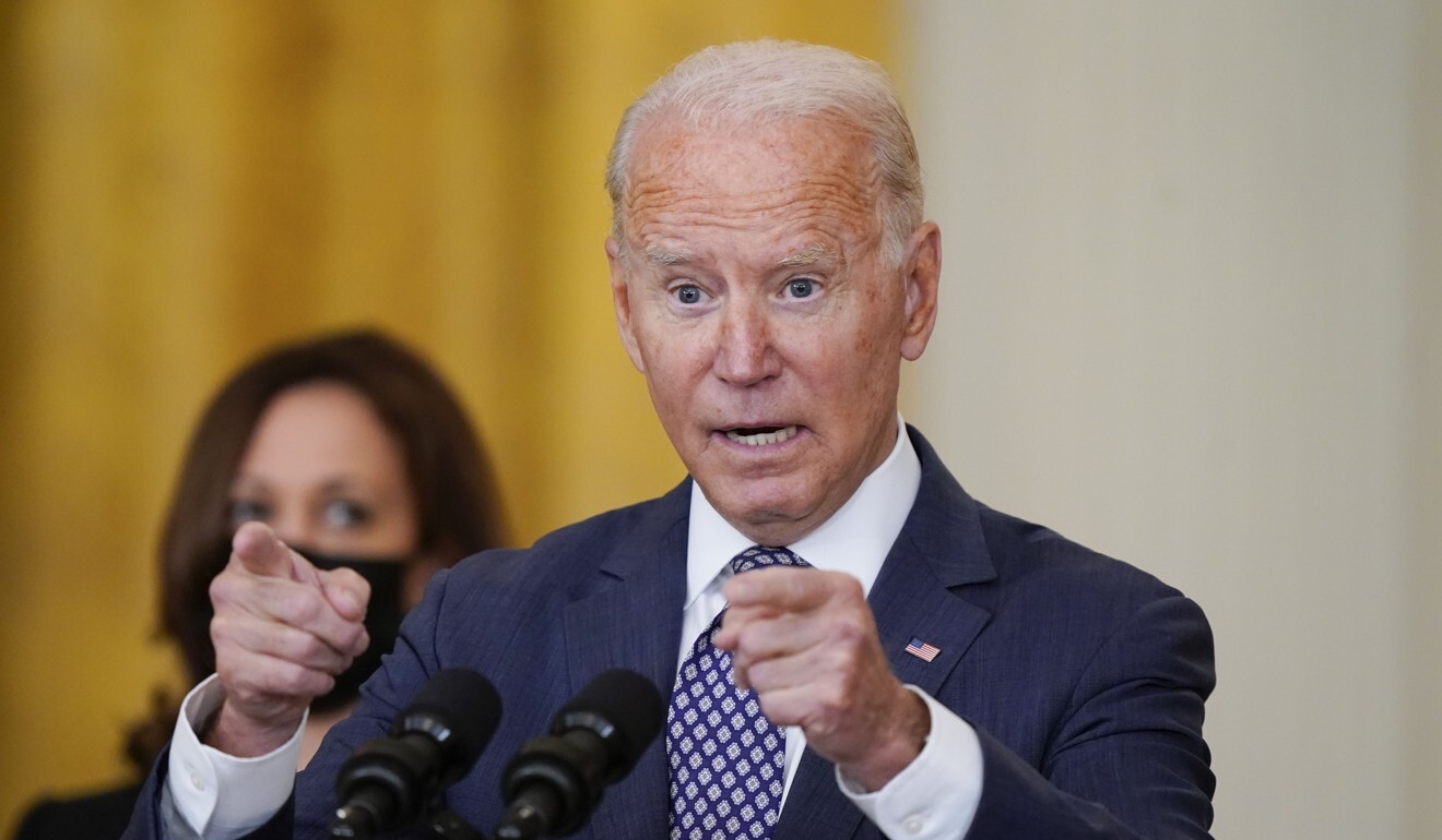 US President Joe Biden, with Vice-President Kamala Harris behind him, taking questions on Friday about the evacuation of American citizens and vulnerable Afghans from Kabul. Photo: AP